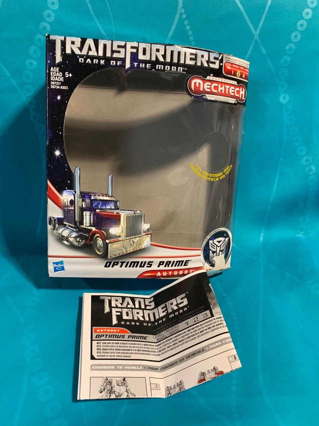 This nice Transformers Dark of the Moon Optimus Prime Mechtech level 2 figure includes the outer box, weapon, and instructions. I have posted many figures so look up my other postings and make a bundle. Willing to trade for Spider-Man stuff, redlines, upper Canada tokens