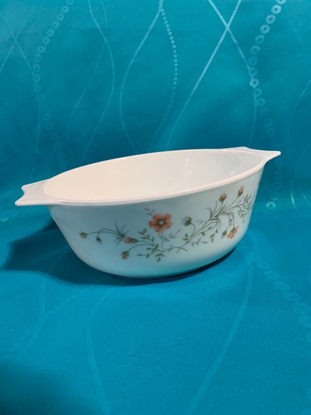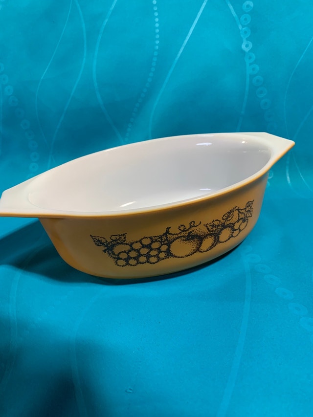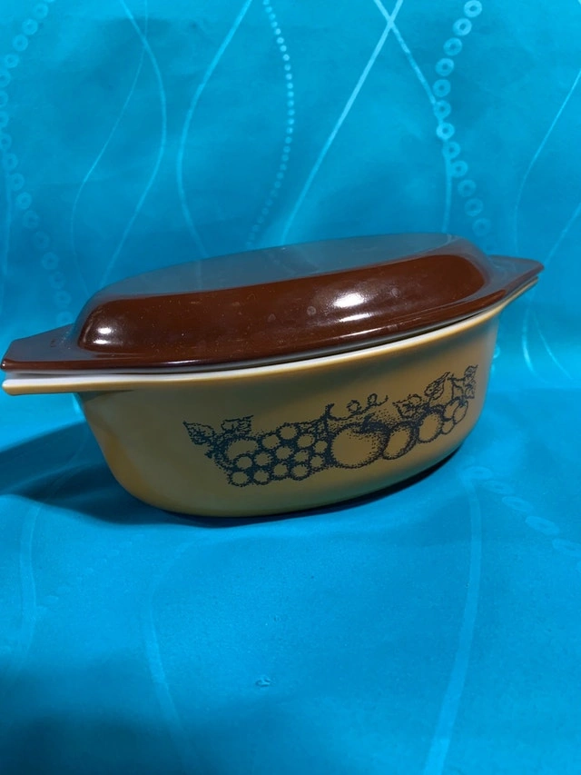 Very nice Pyrex Old Orchard 1.5 quart casserole dish WITH BROWN LID! I will also throw in the other modern round casserole dish
