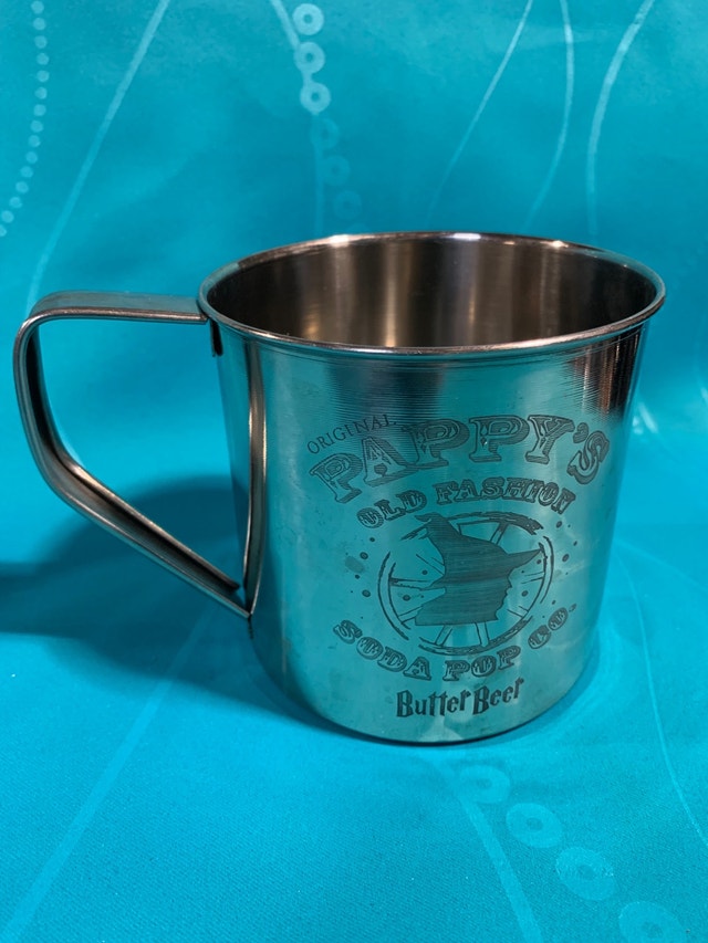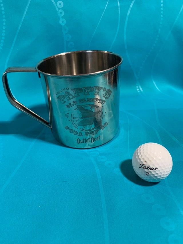 Very cool stainless steel mug from “Original Pappy’s Old Fashioned Soda Pop Co” with the Harry Potter font ButterBeer and wizard with a had. I believe this was part of a limited edition for a Ribfest. Golf ball not included- for size reference. Willing to trade for Spider-Man stuff, redlines, old tokens, pennies