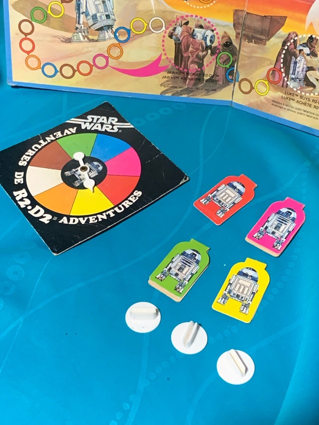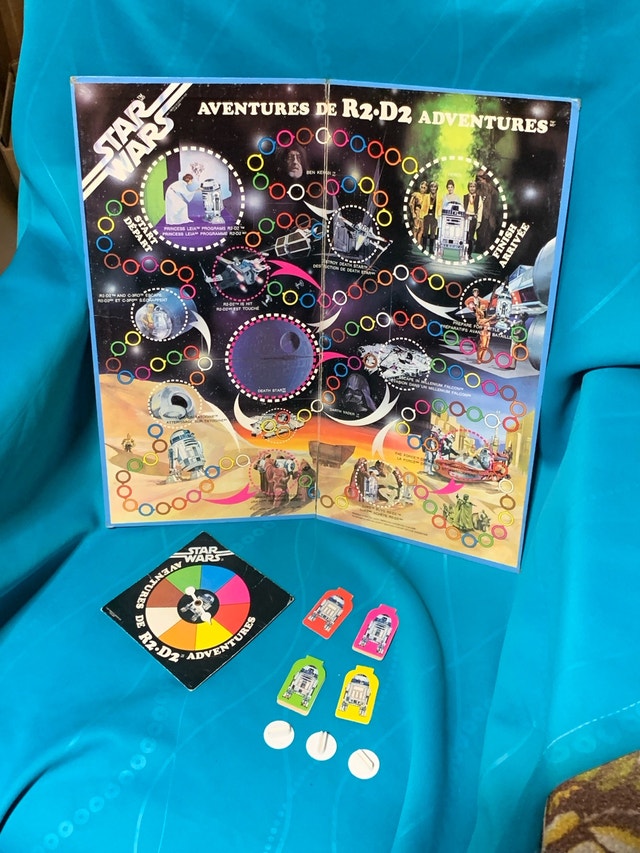 Embark on a galactic adventure with this vintage Star Wars R2-D2 Adventures board game from 1977. This item is in fair condition and includes the board, spinner, playing pieces, and stands—perfect for collectors or those looking to complete their set. Note that the game is missing the instructions, box, dice, and one of the stands. It is the more rare Canadian version which is bilingual. This well-loved board game might be missing its instructions, but the Force is strong with its collectibility and nostalgic charm! If the ad's still up, it's still available.