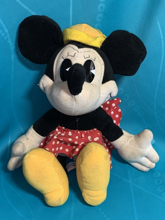 This vintage Minnie Mouse doll stands approximately 14 inches tall and features her classic red and white polka dot dress and yellow hat. Being a pre-loved item, it does show some signs of wear, which only adds to its vintage charm. It's a delightful piece for any Disney collector or a sweet addition to a child's toy collection. Made in Korea by Canasta trading company in the mid 1970s-1980s. While this Minnie Mouse doll isn't brand new, it's still ready to bring joy to a new home. If the ad is up, she's available, so don't miss out on the chance to add her to your collection!