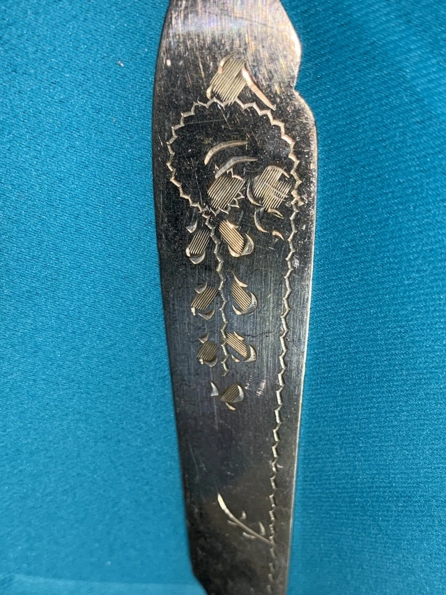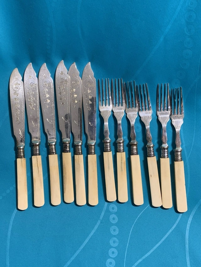 This is a used set of antique fish knives and forks featuring EPNS (Electroplated Nickel Silver) hallmarks and ornate detailing. This set includes 5 forks and 5 knives. These pieces carry a rich history and unique aesthetic, perfect for collectors or adding a touch of vintage elegance to your dining experience. Here are the specifications: * Material: Electroplated Nickel Silver (EPNS) * Set Includes: 5 forks, 5 knives * Style: Antique/Vintage