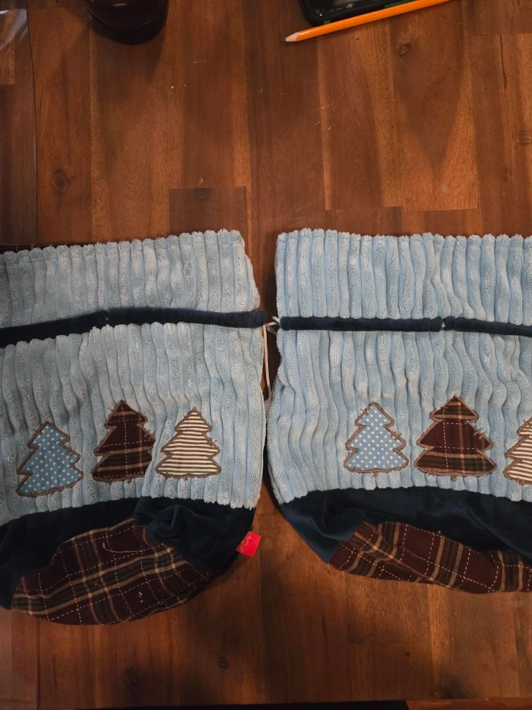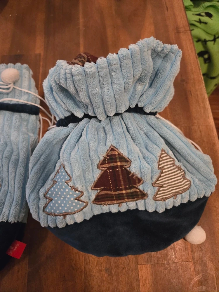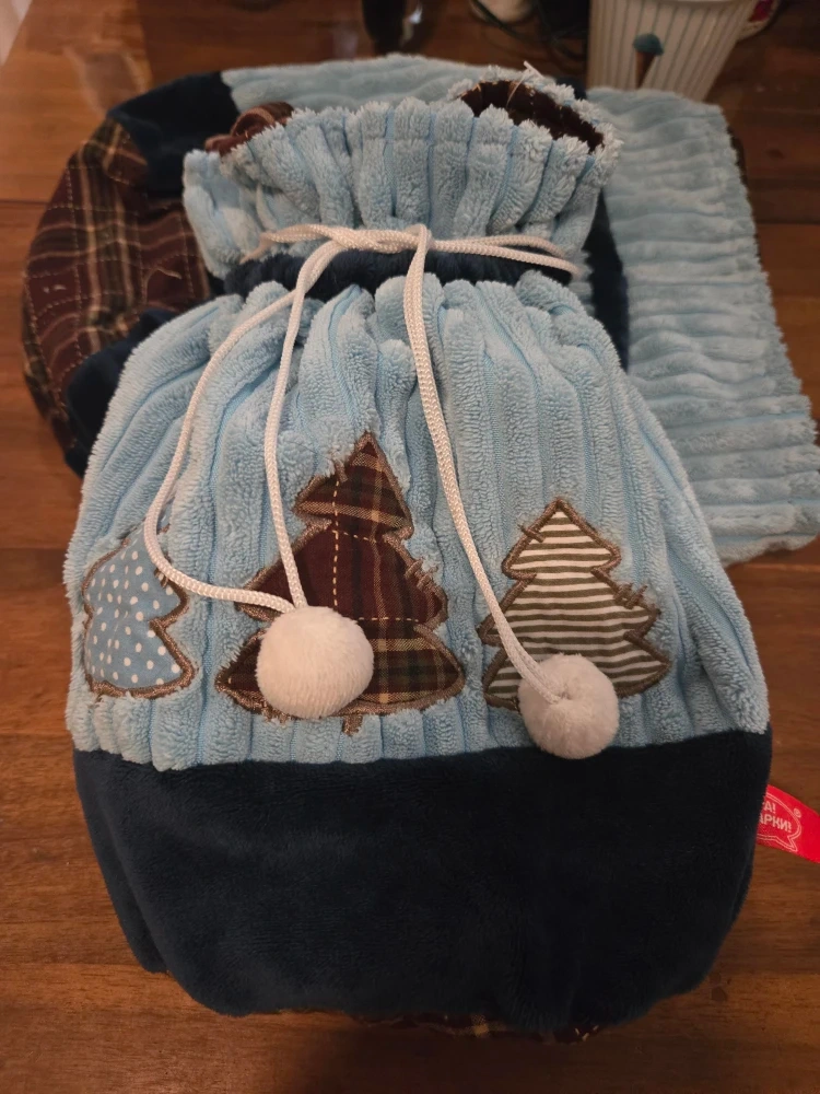 Here's a cute blue drawstring gift bag! It features three Christmas tree appliques in different patterns. The bag is made of a soft, corduroy-like material with a dark blue velvet-like base. Perfect for holiday gifting!