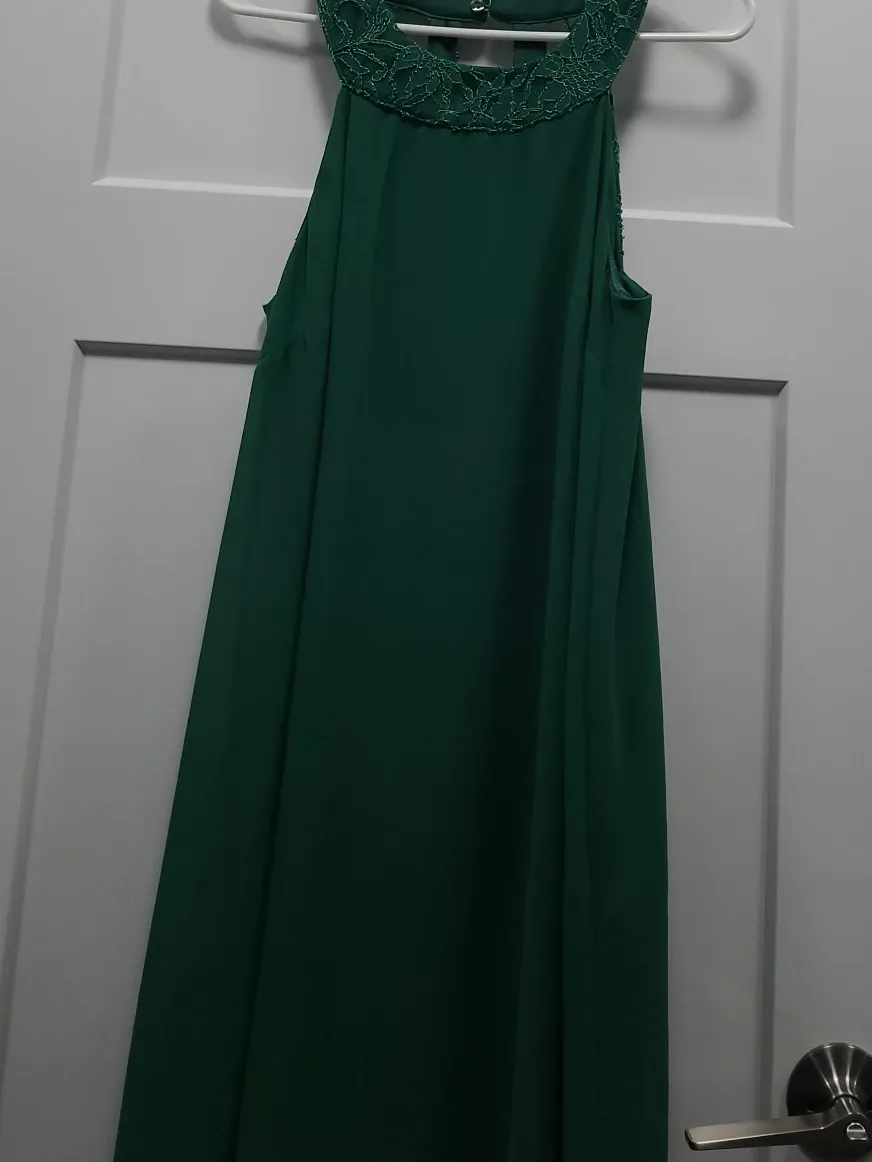 Selling a lovely green halter dress! It has a beautiful lace detail around the neckline. It's in great condition and perfect for a special occasion or a night out