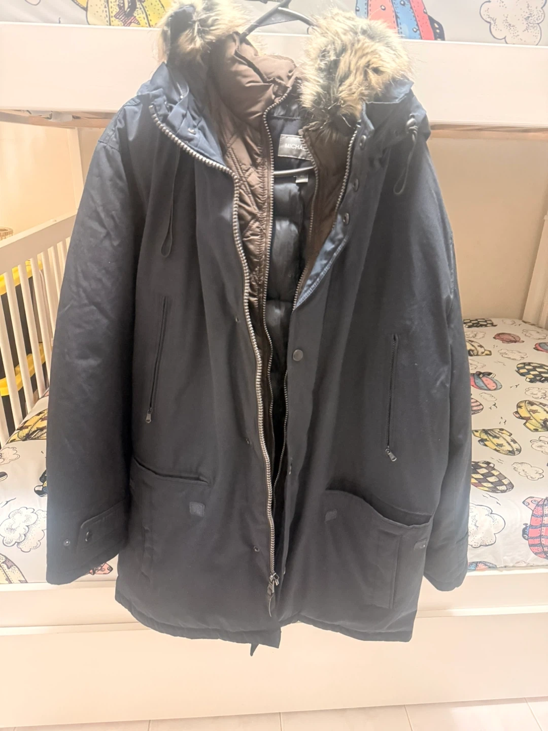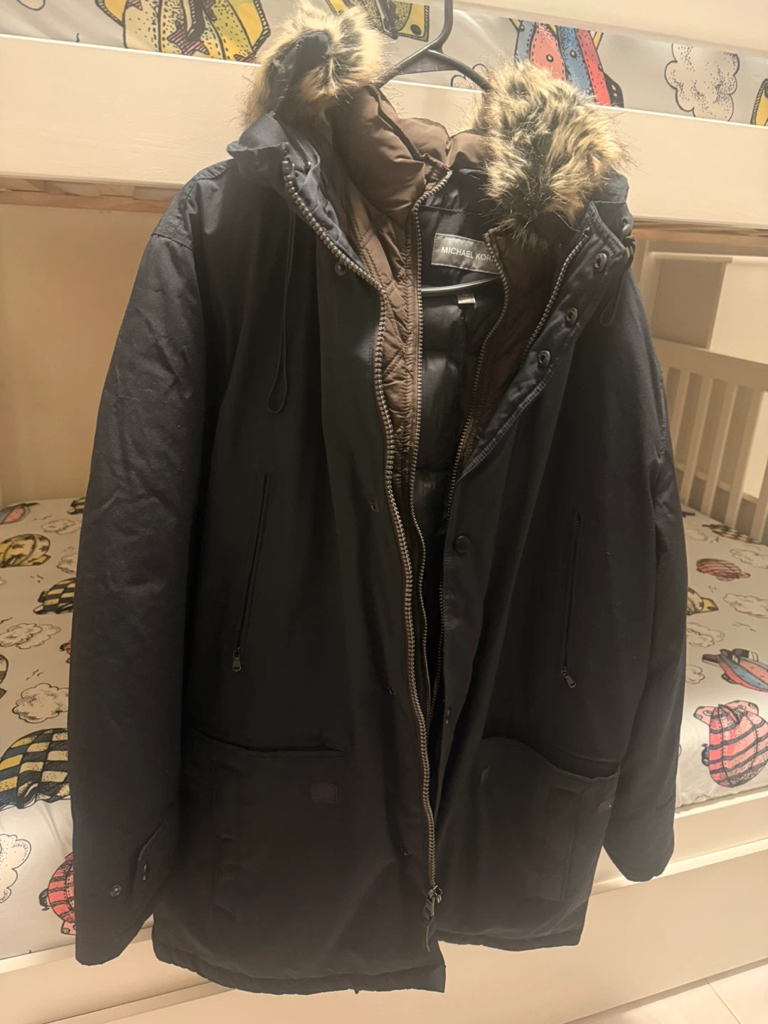For sale is a stylish and warm Michael Kors men’s winter parka in navy blue matte color. This jacket is ideal for cold weather and features a fur-trimmed hood and a zip-up front with button closures. It has multiple pockets for storage and is in excellent condition, having only been worn once!