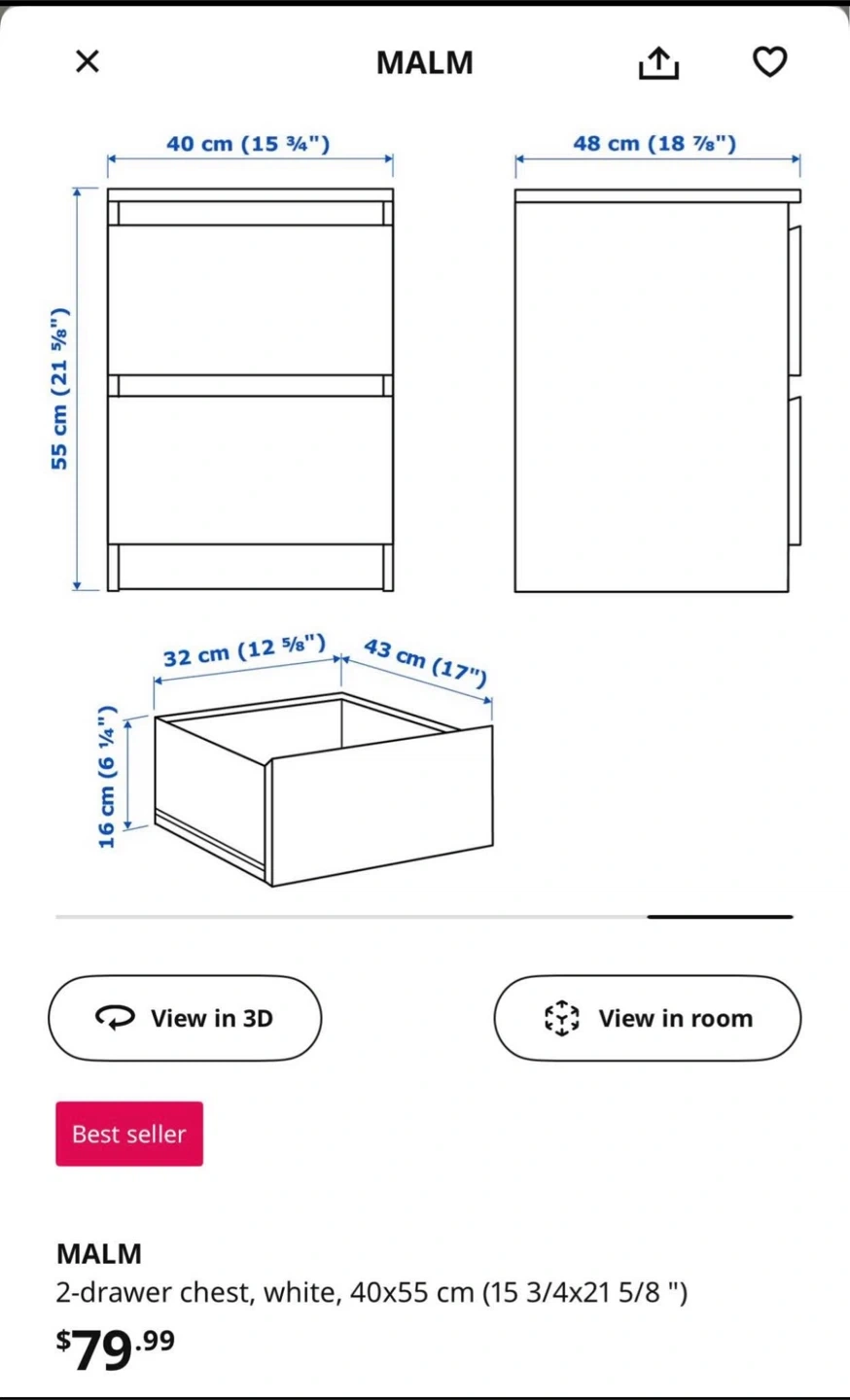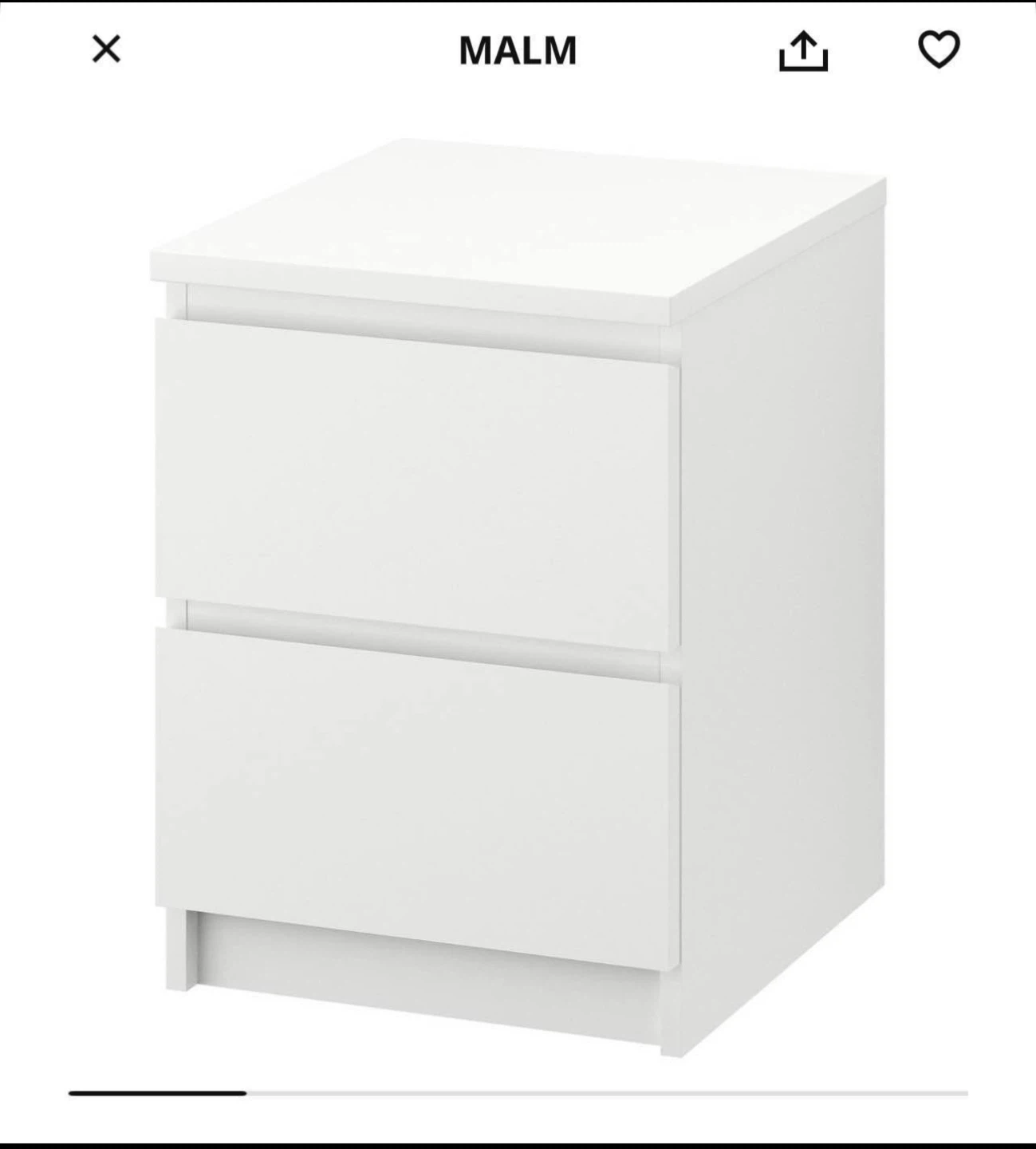 Selling a white IKEA Malm 2-drawer chest. It's in great shape and perfect for a bedside table or extra storage! I have two available at $60 each or $100 if both are purchased.