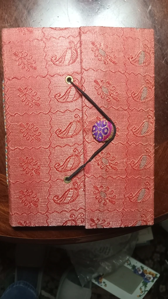Selling a handmade journal. It has a unique fabric cover with a button and string closure. The journal is in good condition and has plenty of blank pages for writing or drawing