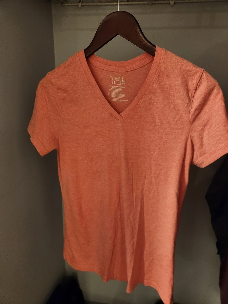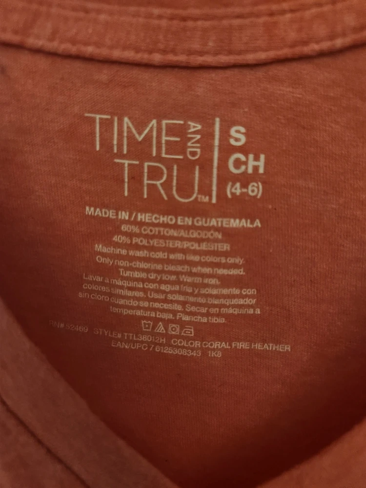 This is a Time and Tru t-shirt in a lovely coral fire heather colour. It's a size small (4-6). The material is 60% cotton and 40% polyester. It's in great condition and ready for a new home!