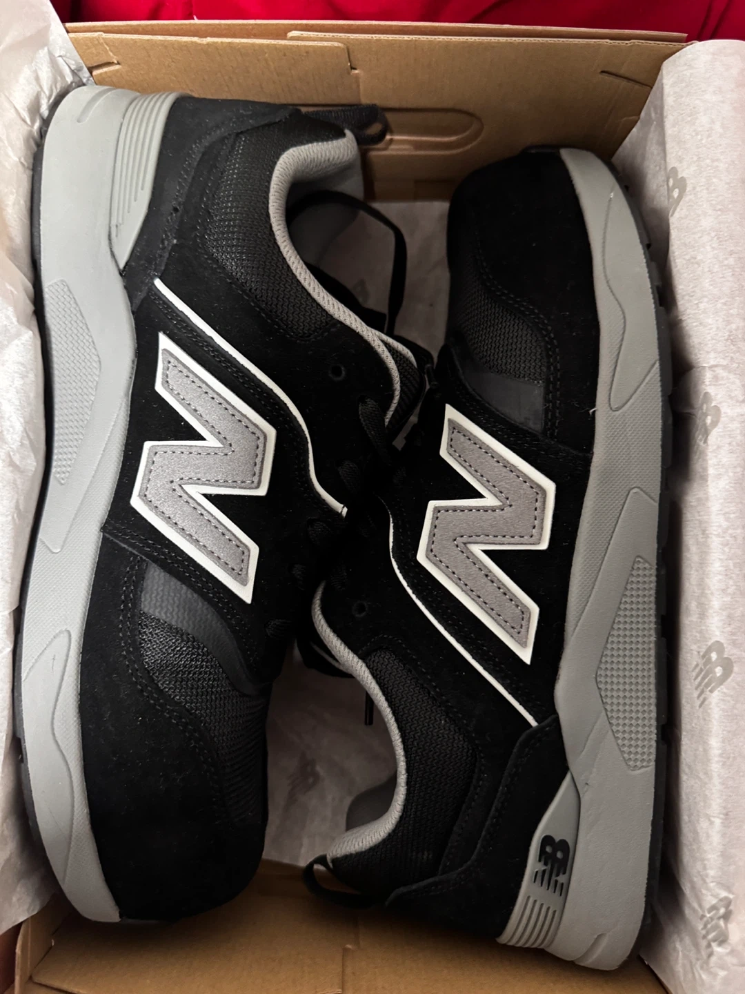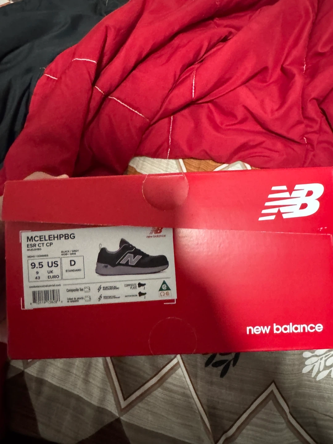 I'm selling a pair of New Balance MCELEHPBG ESR CT shoes in black and grey, size 9.5 US. These are in new condition and come with the original box