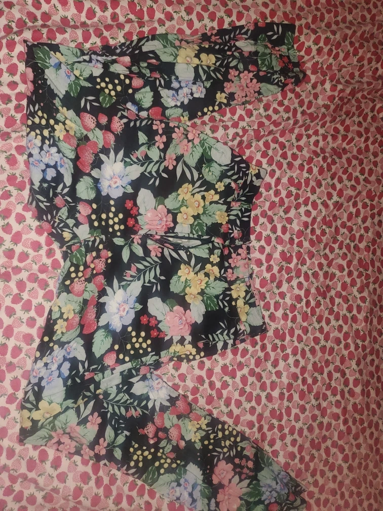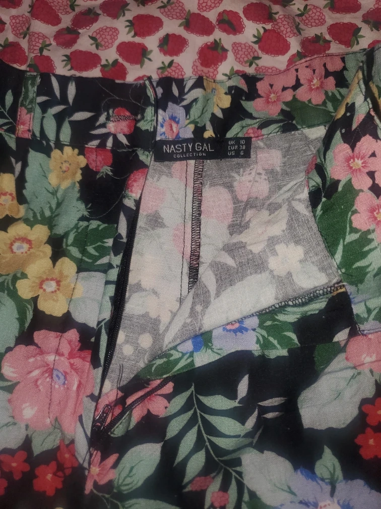 Selling a pair of floral pants in size 6. They're in great condition and feature a colourful floral pattern on a black background. Brand is Nasty Gal.