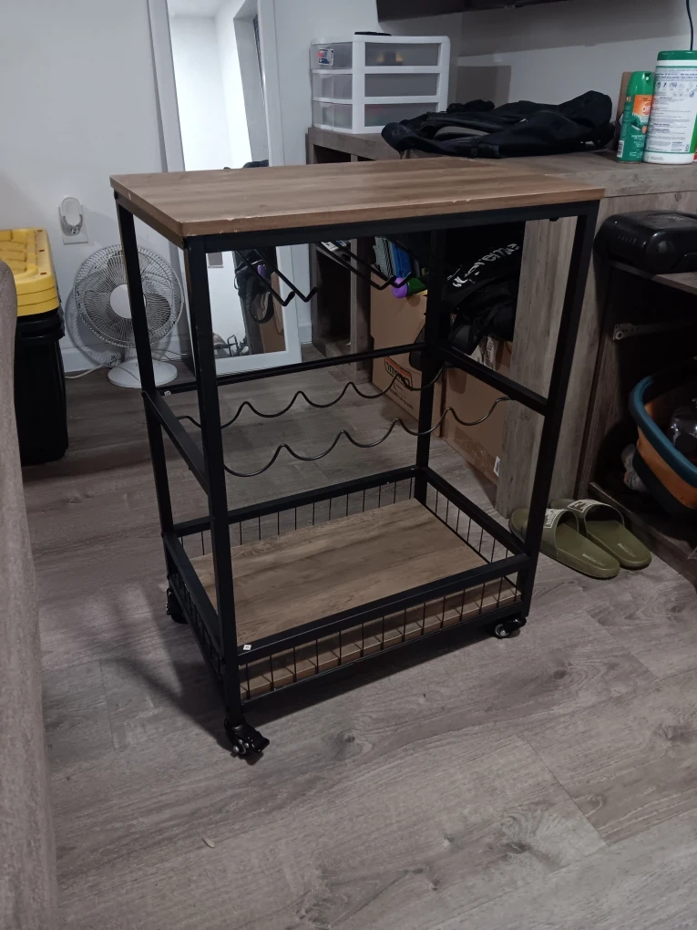 I'm selling a rolling bar cart! It features a wine rack and a sturdy design. Perfect for entertaining or adding a touch of style to your home. Condition - used