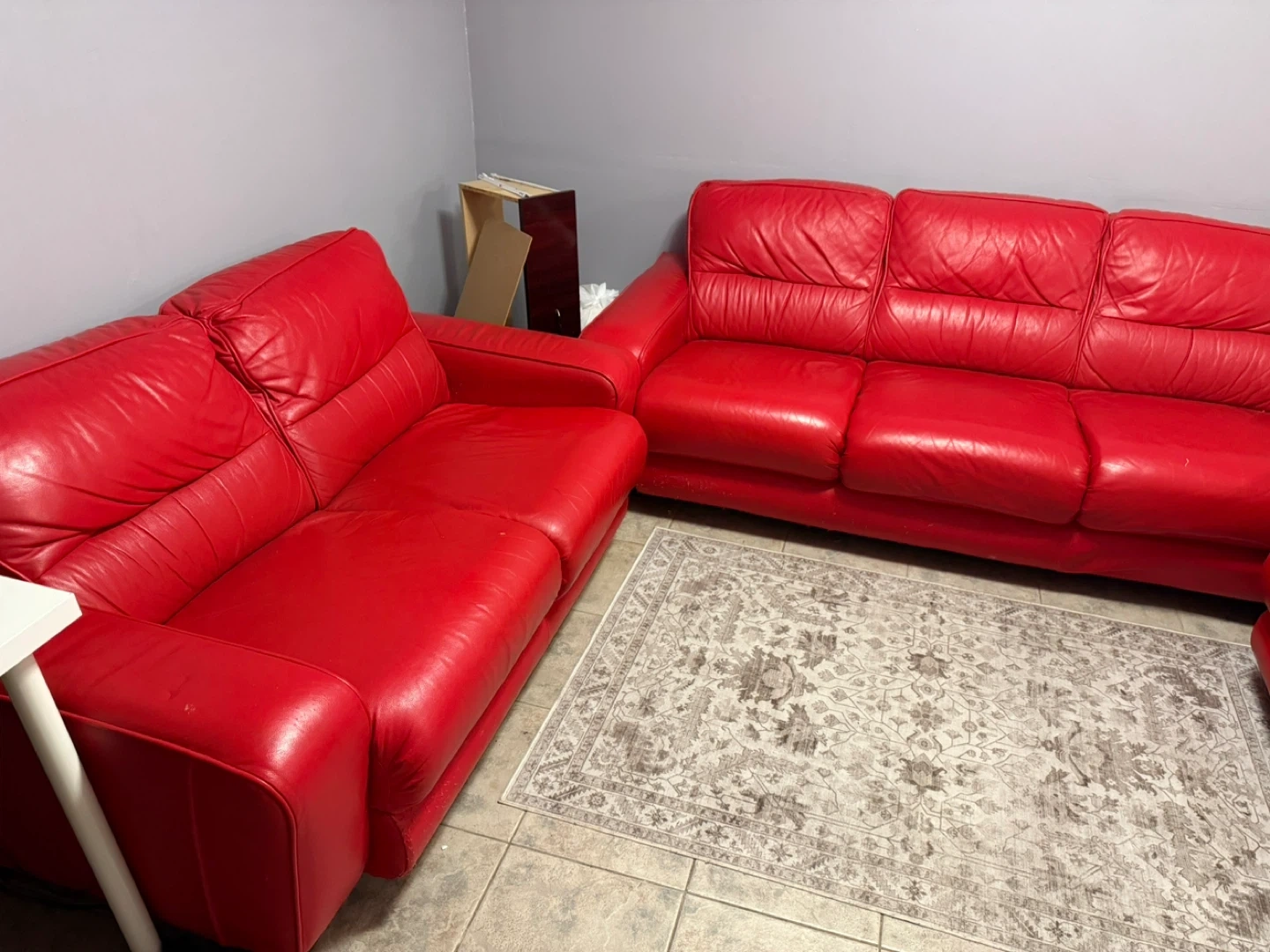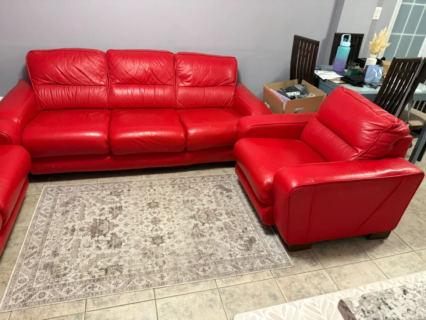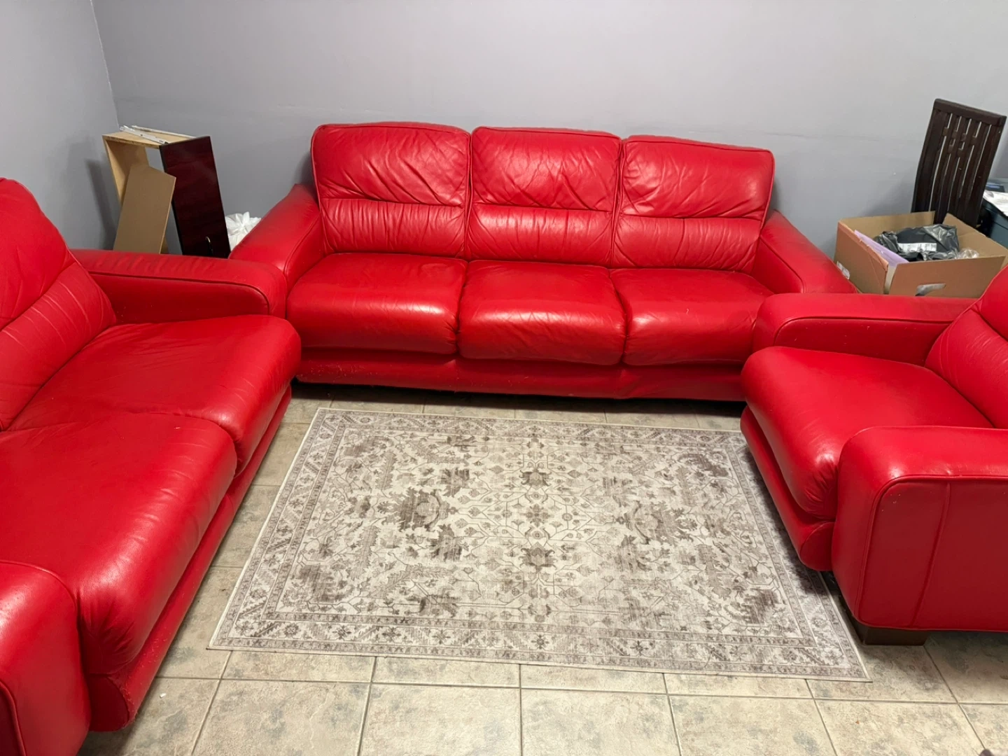 Selling a vibrant red leather sofa set! This includes a 3-seater sofa plus two seater and a single sofa. It's a great way to add a pop of colour to your living room. The set is in used condition and still has lots of life left!