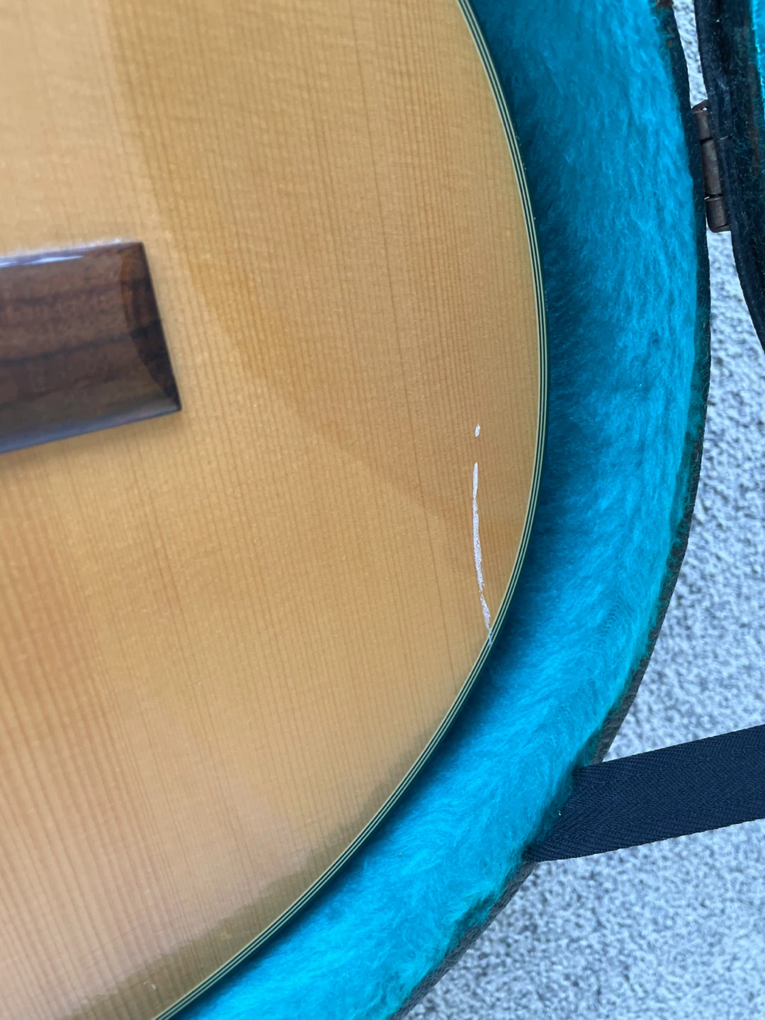 The guitar is in good condition. There are some minor cosmetic imperfections, including a finish scuff/scratch on the lower-front bout and a couple of minor scuffs on the back (see photos/video). These are purely cosmetic and do not affect the sound or playability whatsoever. The case is sturdy and in great shape.