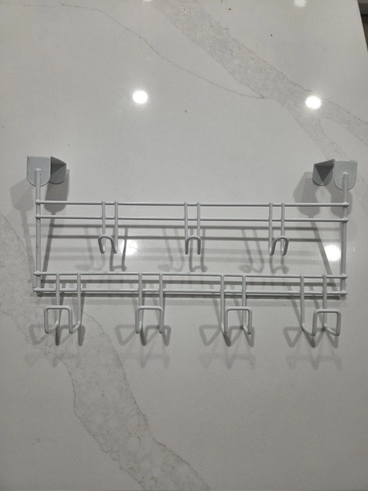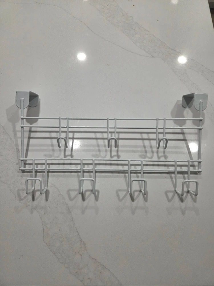 Keep your space organized with this handy over-the-door hook rack! It's perfect for adding extra hanging space in your closet, bathroom, or any room where you need a little more organization. The rack is white and in great condition.