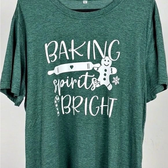 No tags but this is new. Roomy Generic Festive green t-shirt with 'Baking Spirits Bright' print. Features a gingerbread man and rolling pin design. Lots of stretch while you dance around the kitchen making your favourite tummies happy! Location NW Edmonton, 120 St. and 173A Avenue