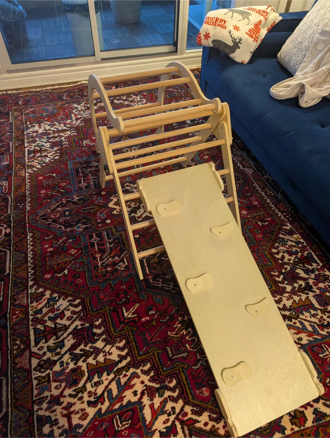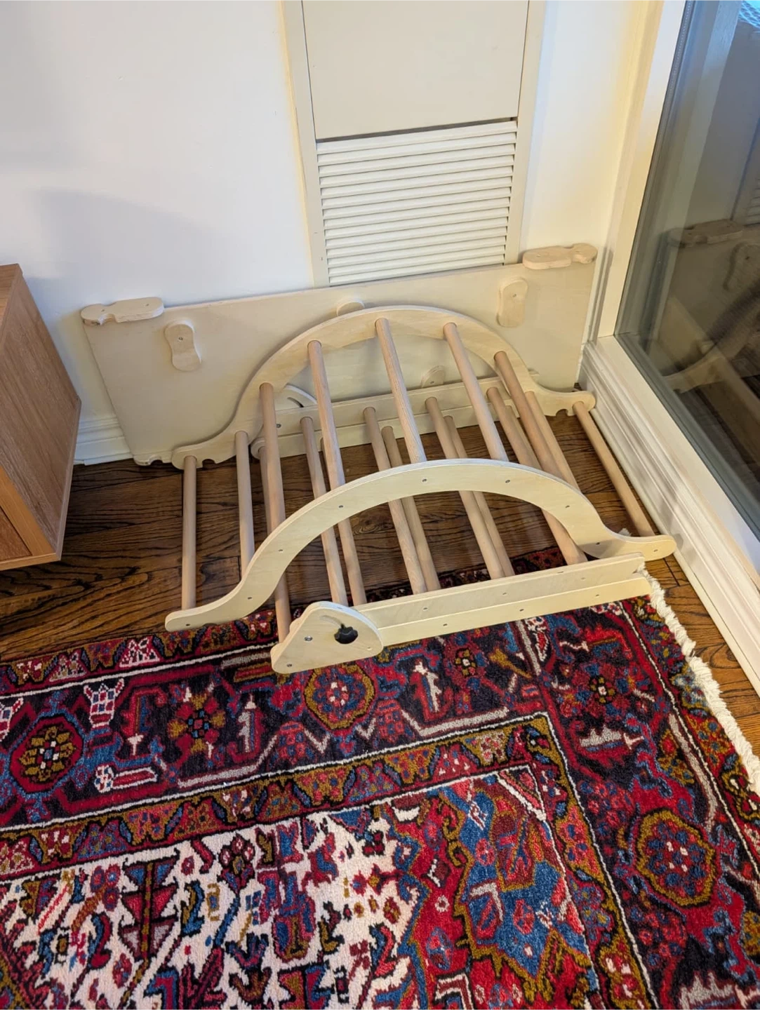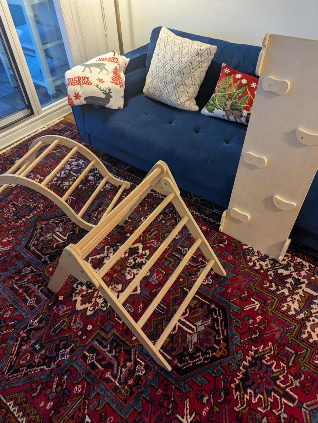 Selling a wooden climbing triangle set! It's a great set for toddlers and young kids to develop their motor skills and have fun. The set includes a climbing triangle, a ramp, and an arch. The triangle piece has a screw that no longer works, but the triangle is functional and will stand straight. The other two pieces are in perfect condition.