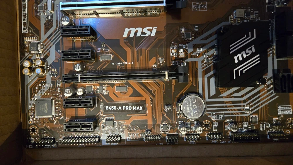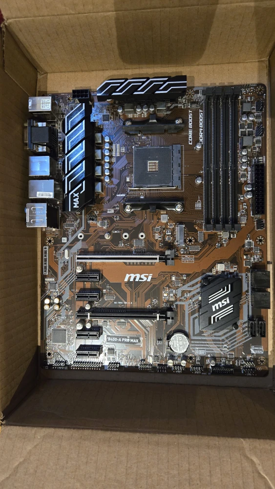 Selling a used MSI B450-A PRO MAX motherboard. It's in good condition, no original packaging but has a box for transport. Great for building a new PC and very versatile. Has had a chip resoldered by a technician, otherwise works great.