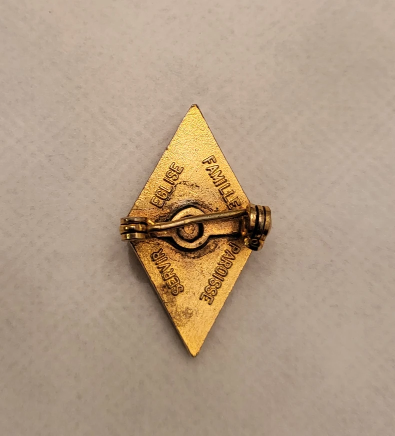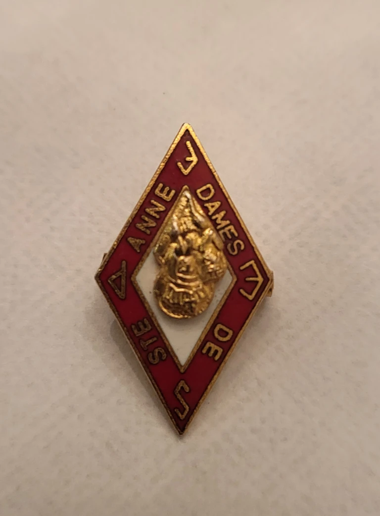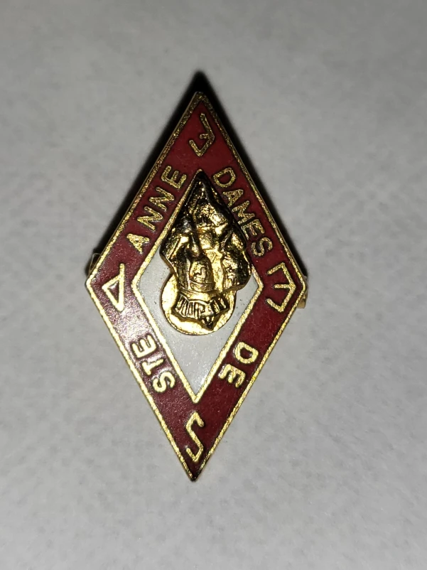 This is a vintage lapel pin from the 1950s featuring the Catholic religious order Dames de Ste Anne. It's diamond shape with red, white, and gold colours.