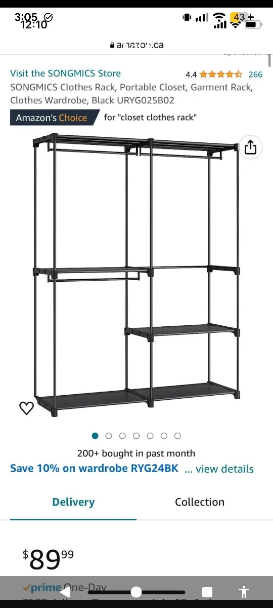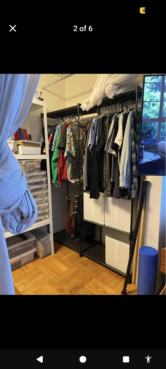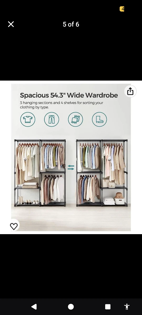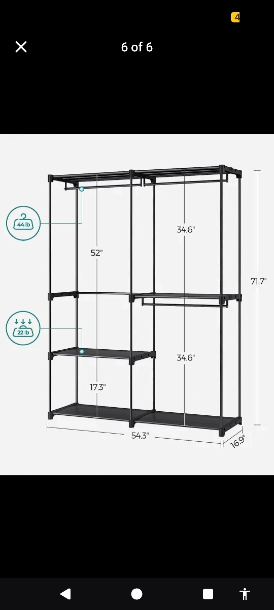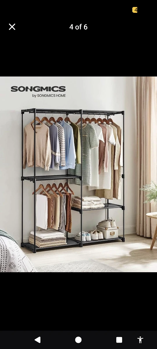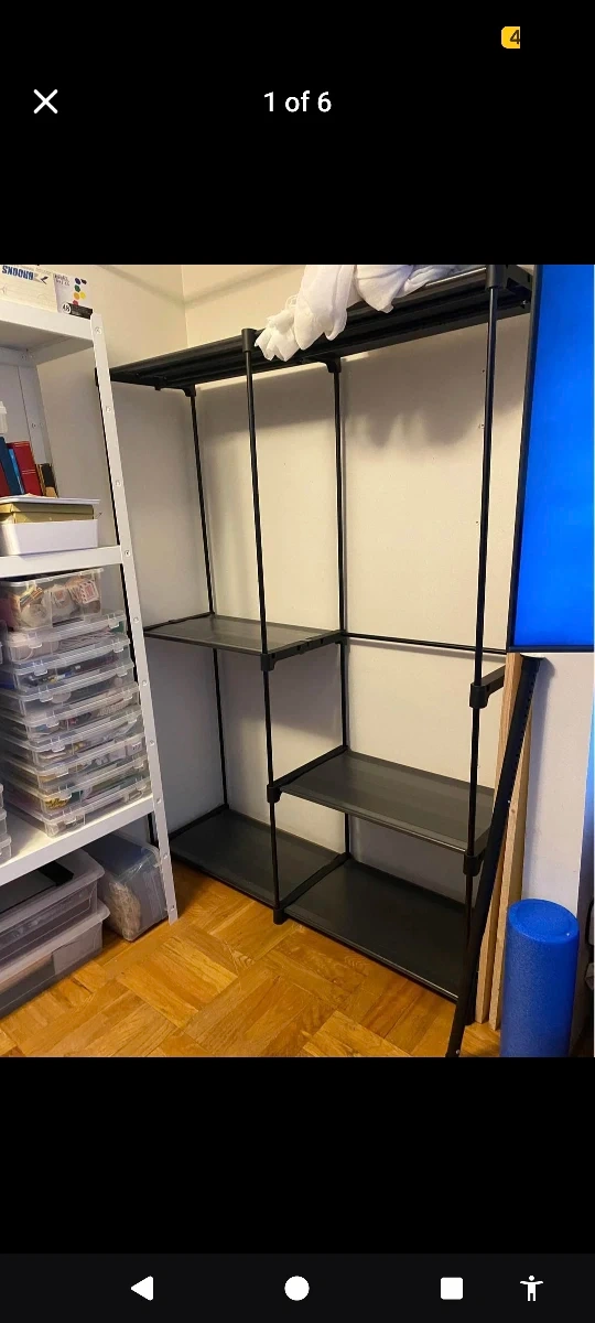 Selling a SONGMICS clothes rack wardrobe in black! It's a portable closet with a garment rack. It's spacious with a 54.3" wide wardrobe, featuring 3 hanging sections and 4 shelves for sorting your clothing. Originally bought for $89.99