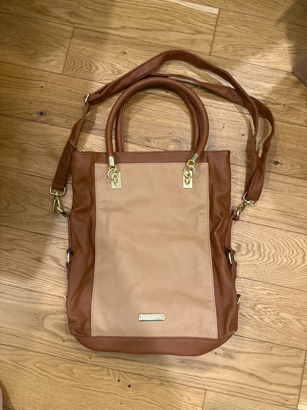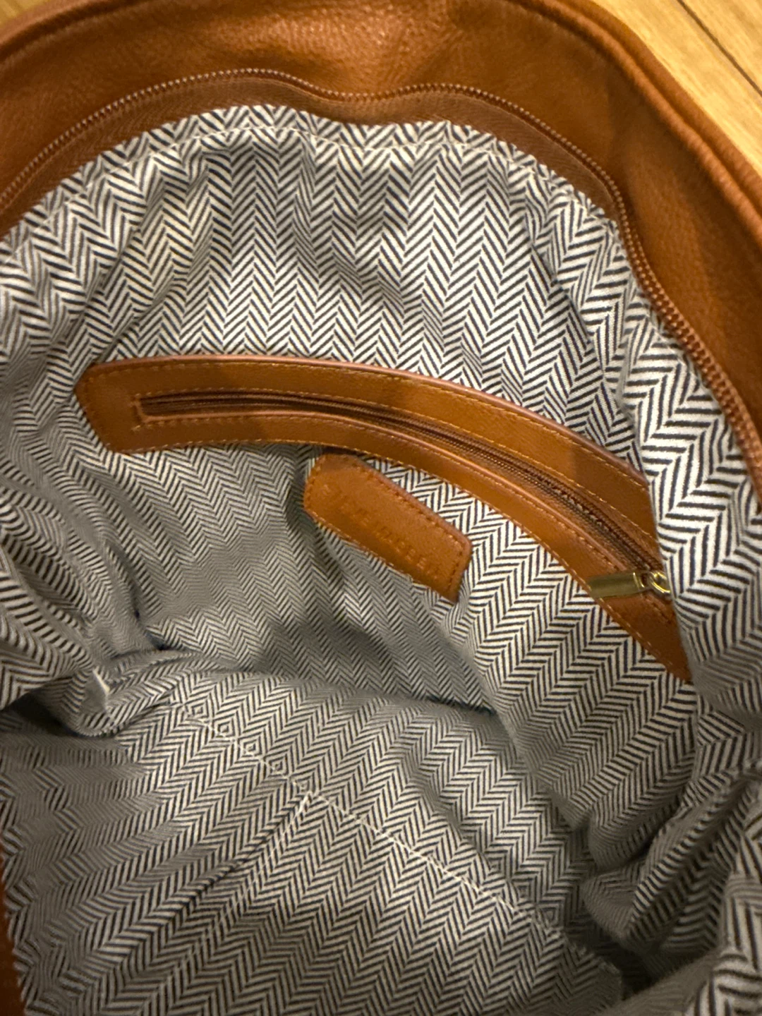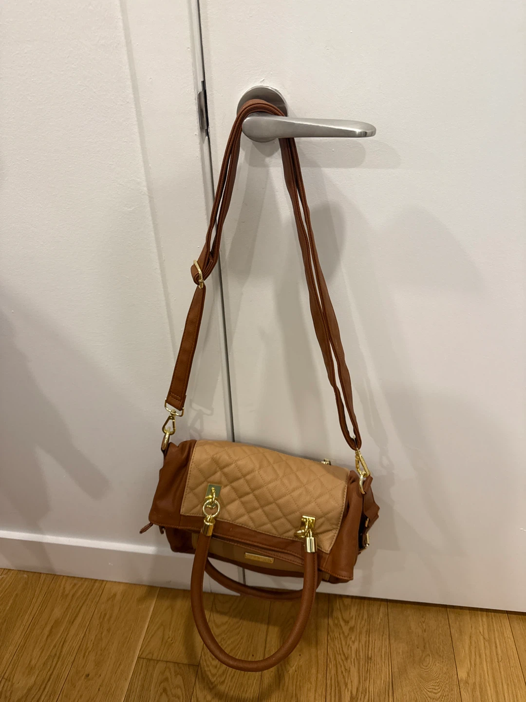 This satchel bag features a quilted design in shades of brown. It has both handles and a shoulder strap, so it can be carried in multiple ways. The interior has a patterned lining and a zippered pocket!