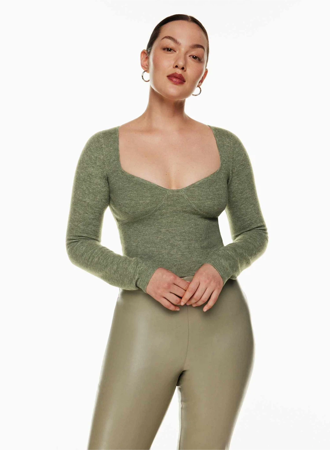 Take your sweetheart to dinner. This is a fully fashioned bustier sweater with a sweetheart neckline. It's knit with warm, soft-brushed yarn with a hint of merino wool and cashmere. It's constructed using a Double Knit stitch for structure and a flat, dense feel.