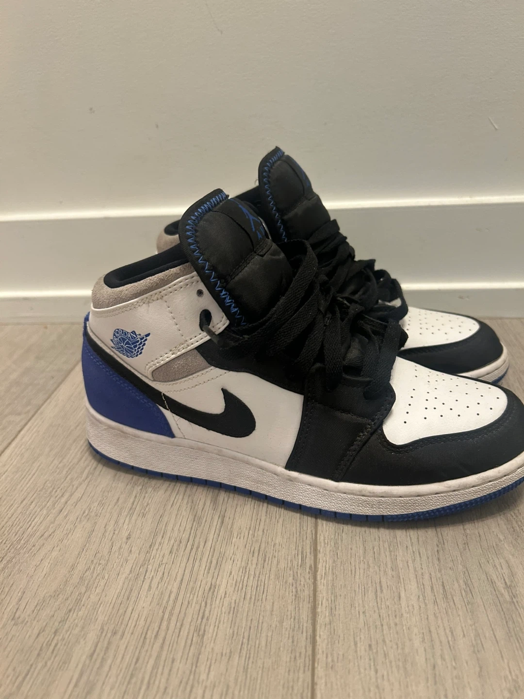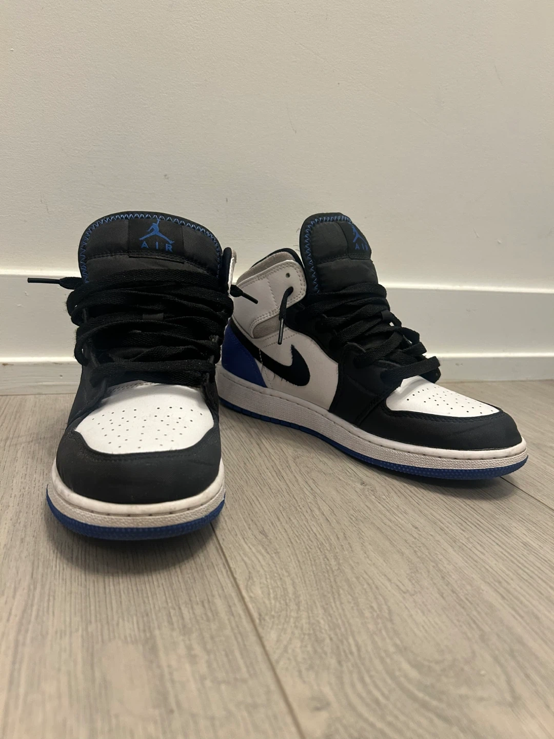 Selling a pair of Air Jordan 1 Mid sneakers in black, white, and royal blue! Only used twice They're in great condition and are a size 6.5 in US sizing. Perfect for everyday wear or for adding to your sneaker collection! Willing to negotiate a little bit