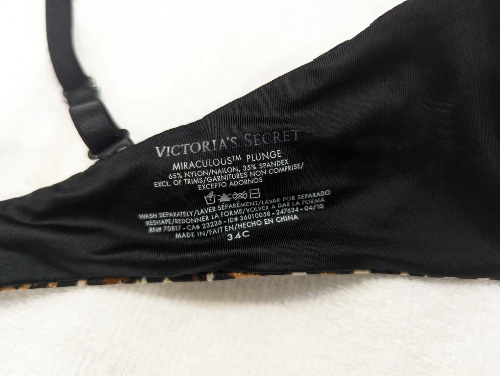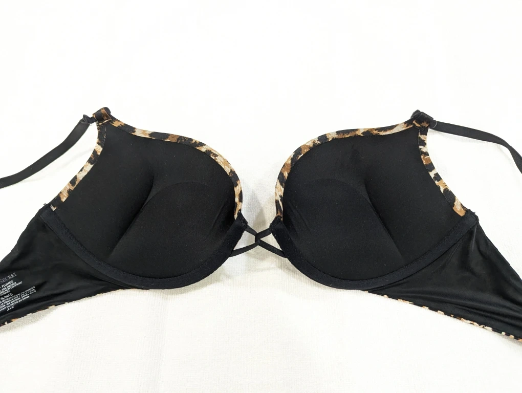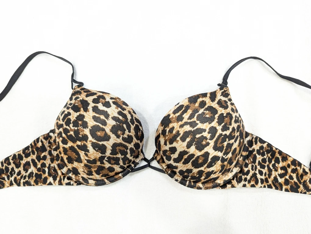 Selling a Victoria's Secret Bombshell Plunge bra in size 34C. It features a fun leopard print on the outside and a black interior. The material is 65% nylon and 35% spandex. Cash only.