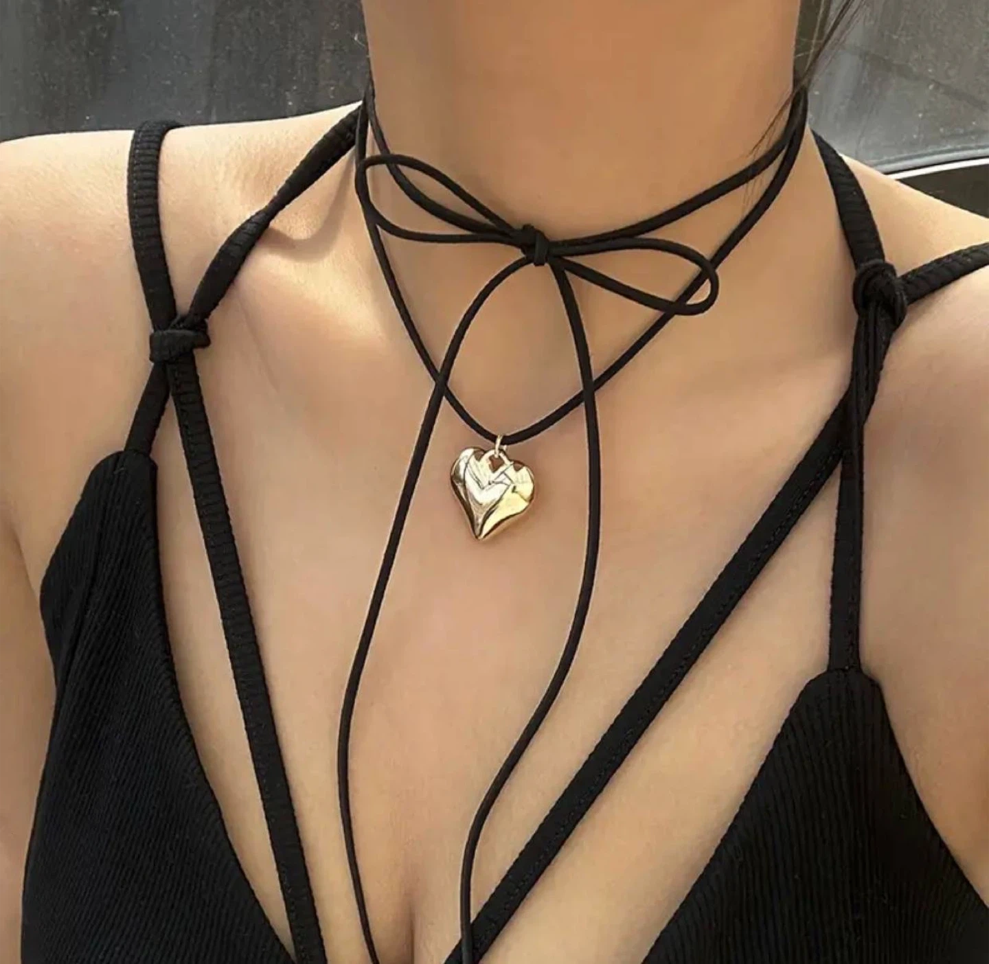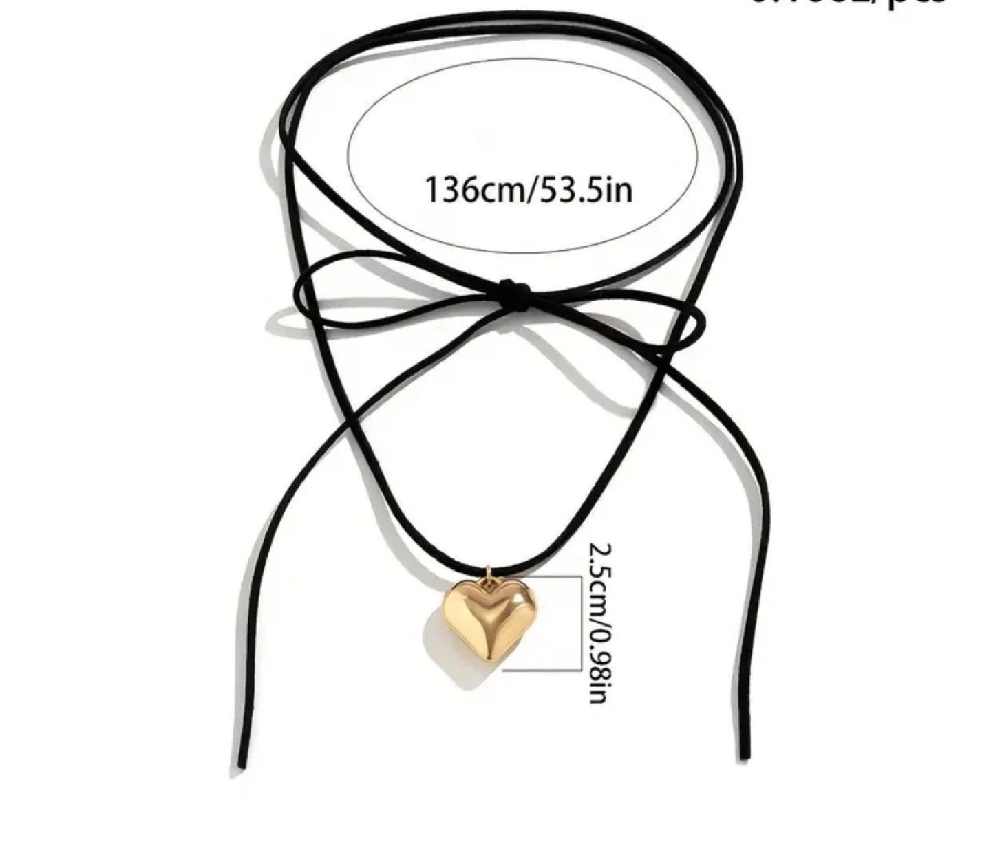 Adjustable black cord choker necklace. Features a puffy gold heart pendant. Stylish and cute