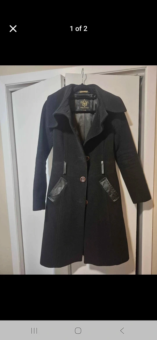 Here's a stylish black wool blend coat from Mackage! It features a unique design with leather-like accents on the pockets and shoulders. Perfect for keeping warm and looking chic during the colder months