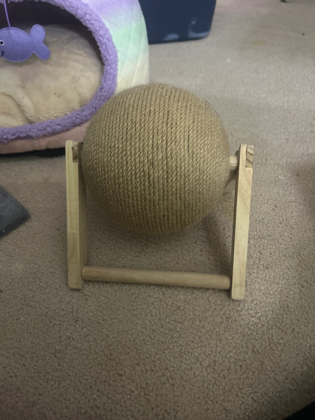 Here's a fun cat scratching ball toy! It's in great shape and ready for a new feline friend to enjoy. The ball is wrapped in a natural rope material, perfect for scratching and play. It has a sturdy wooden base.
