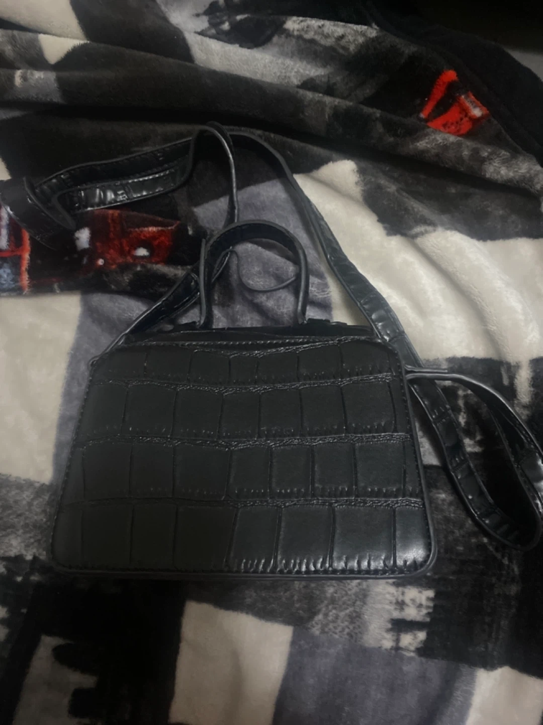 This is a cute little black mini bag with a crocodile pattern. It's perfect for carrying just the essentials and it a cross bag that wraps around your shoulder…..