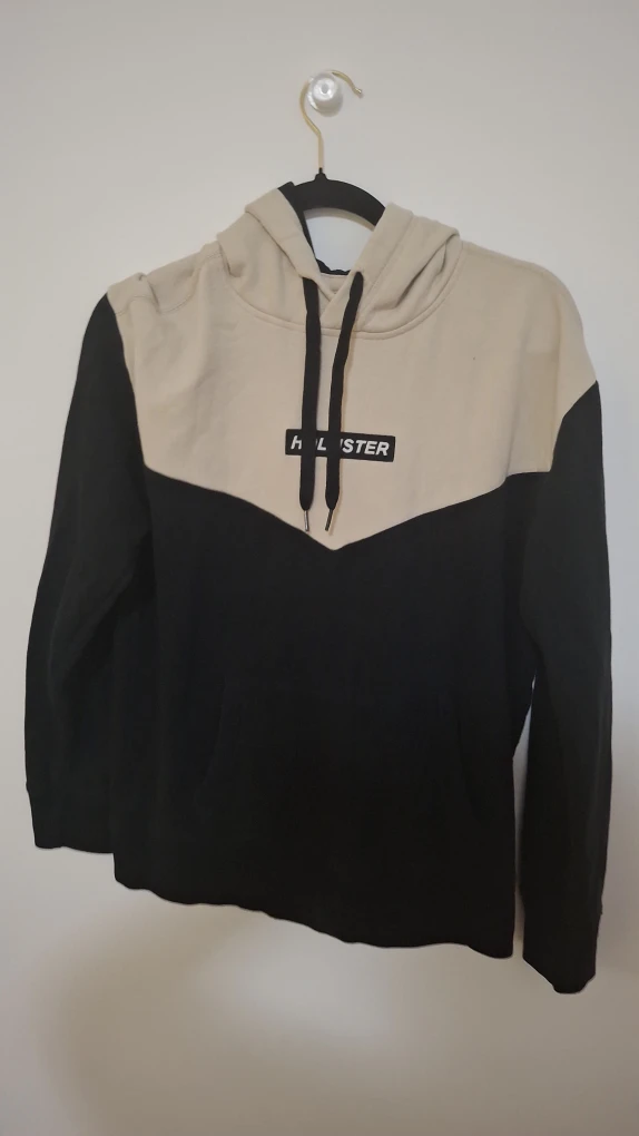 Selling a Hollister hoodie with a cool color block design! The top is a light beige color, and the bottom and sleeves are black. It's in great condition and ready for a new owner
