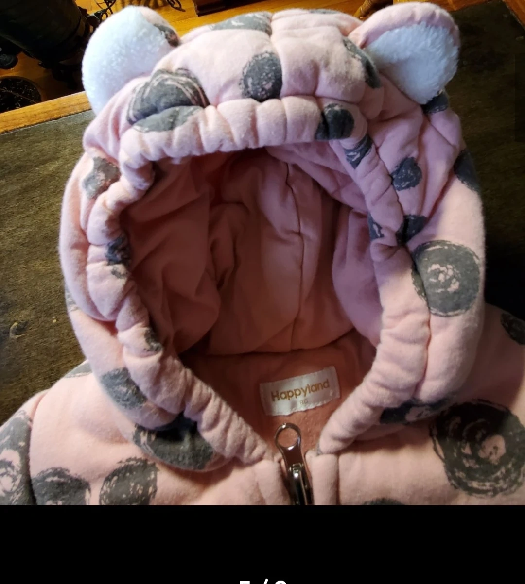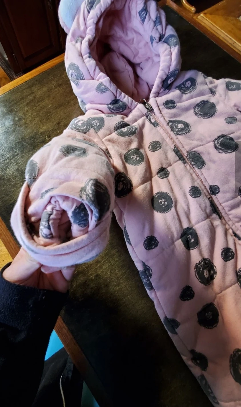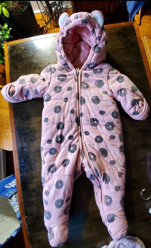 A cute pink baby snowsuit with a hood. The snowsuit has a zipper and a pattern of gray circles. It's perfect for keeping your little one warm and cozy during the colder months.