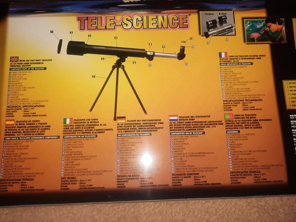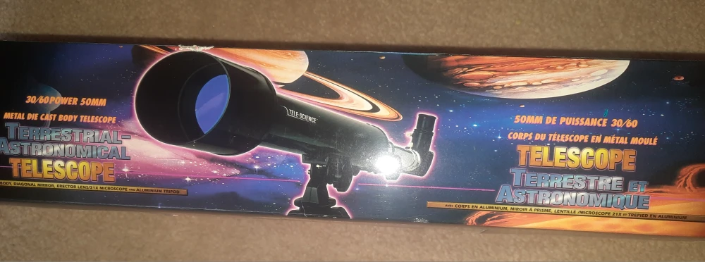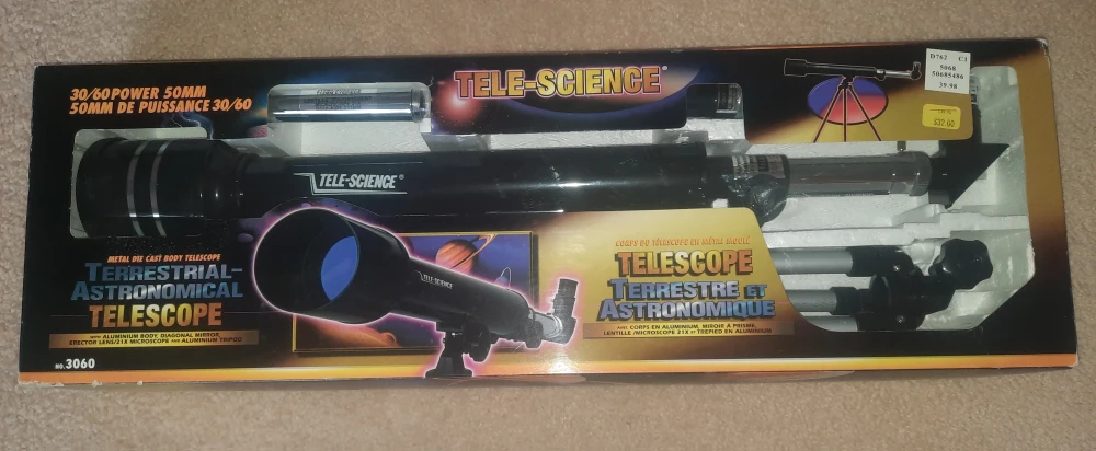 Selling a Tele-Science terrestrial astronomical telescope! It's a metal die-cast body telescope with 30/60 power and a 50mm lens. It includes an aluminum body, diagonal mirror, erector lens/21x microscope, and aluminum tripod. Great for exploring the stars!