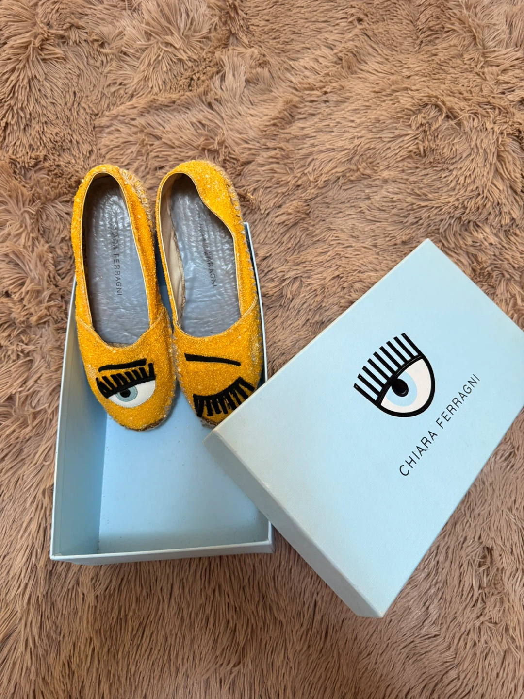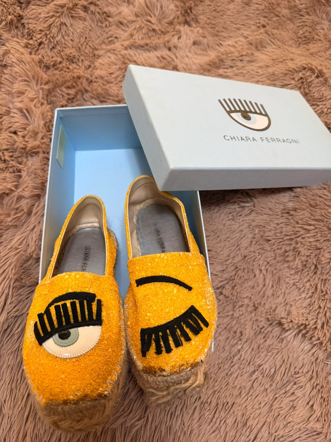 Chiara Ferragni espadrille flats in size 37. They feature a unique eye design and a sparkly yellow finish. Comes with the original box!