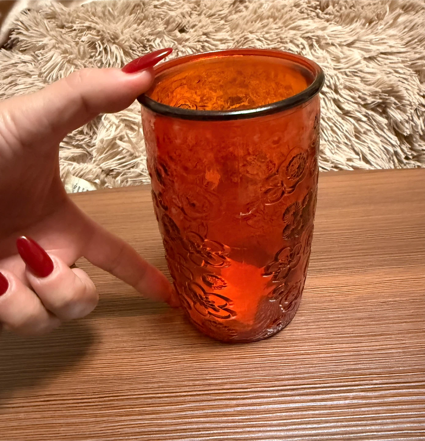 An orange glass vase with a floral pattern. It's in great condition and would look lovely with flowers or as a decorative piece on its own.
