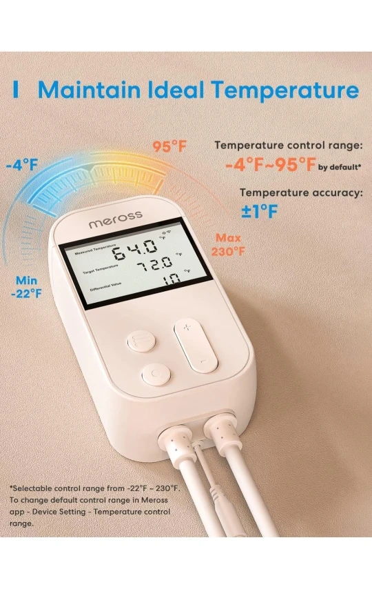 ๐ช๐ฒ๐น๐น ๐ ๐ฎ๐ฑ๐ฒ ๐ค๐๐ฎ๐น๐ถ๐๐: Using a rarely seen ๐๐๐ ๐๐ฐ๐ฟ๐ฒ๐ฒ๐ป , meross plug in temperature outlet provides a clearer and more refined display compared to traditional segmented displays. Equipped with thicker and longer power cords, it offers enhanced durability and a wide range of Usage. Power Cord: 1.5m (on thermostat), 25cm (on socket). Sensor Cord: 2m