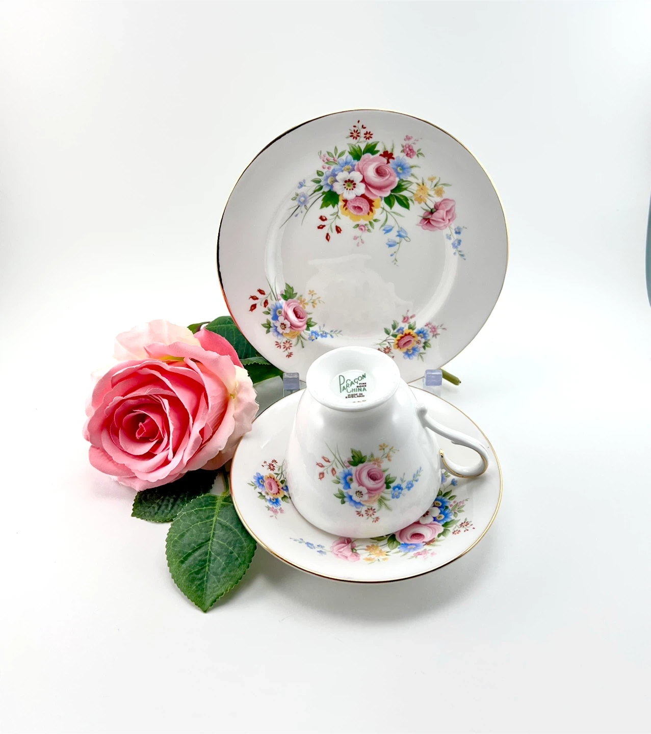 Vintage Paragon (made in England) fine bone china teacup trio. Includes (1) teacup, (1) saucer & (1) small dessert plate. No chips, cracks, crazing or gold loss — both pieces ping/ring