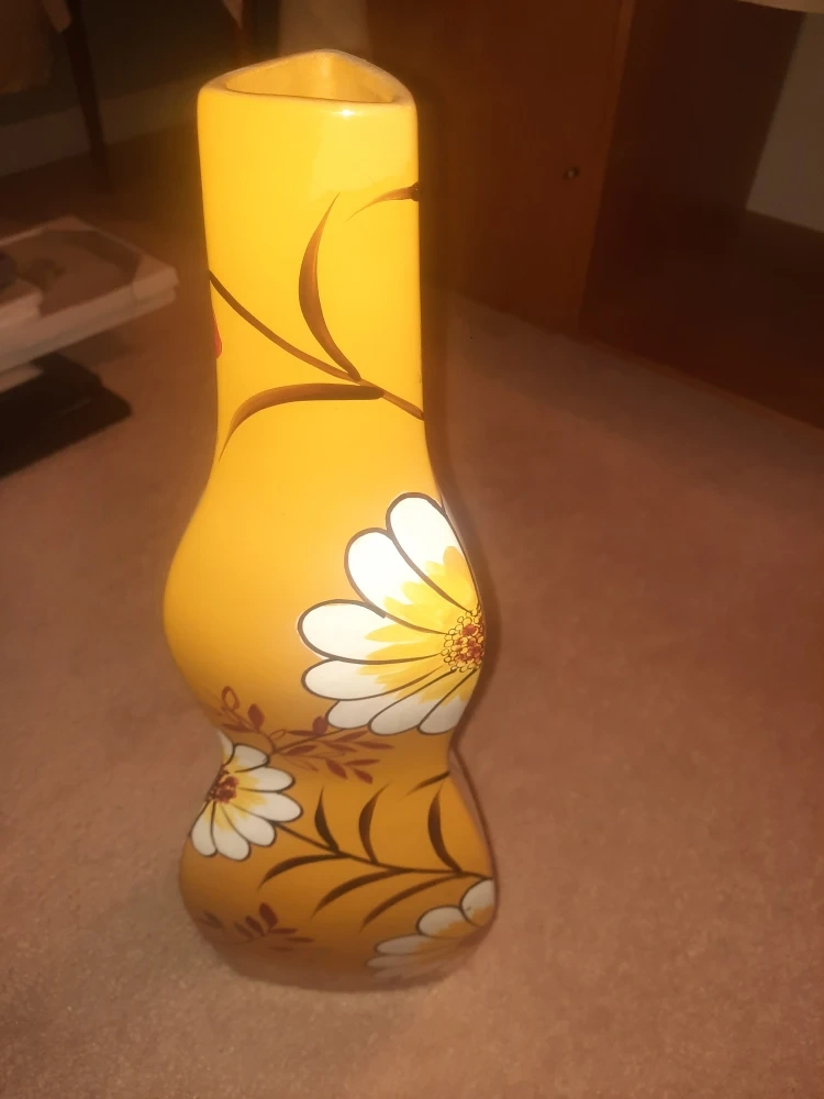 Here's a lovely yellow vase with a floral design! It would look great in any room and add a touch of warmth and charm. Place on the Floor/Shelf/Mantle as a decorative accent. Excellent for Corners. Approx height is 20.5". $10