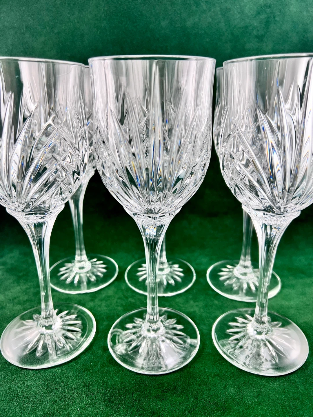 Set of 6 large fine crystal stemmed large water goblets. In mint condition— no chips, cracks or etching. Glasses measure 8.5” tall