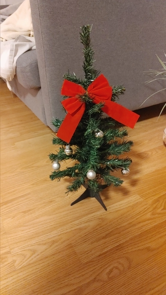 A cute little Christmas tree, perfect for adding some festive cheer to a small space! It's decorated with a red bow and some silver ornaments.