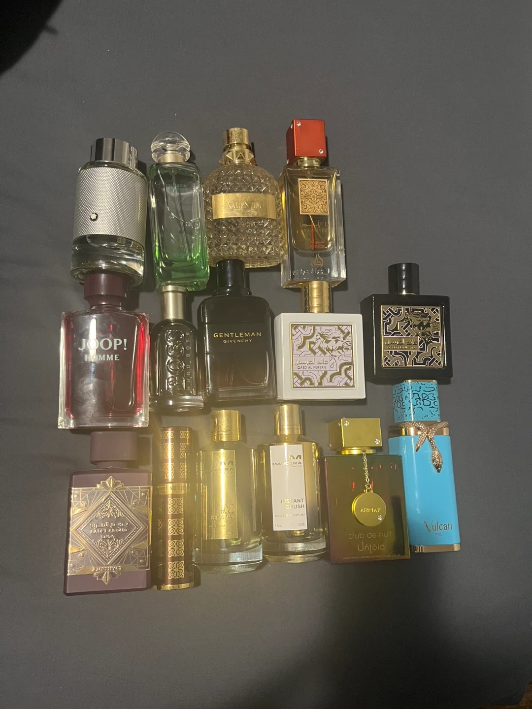 Selling a collection of perfume bottles from various brands! You'll find popular names like Valentino, Givenchy Gentleman, Joop! Homme, Mancera Instant Crush, and Armaf Club de Nuit Untold, along with Vulcan