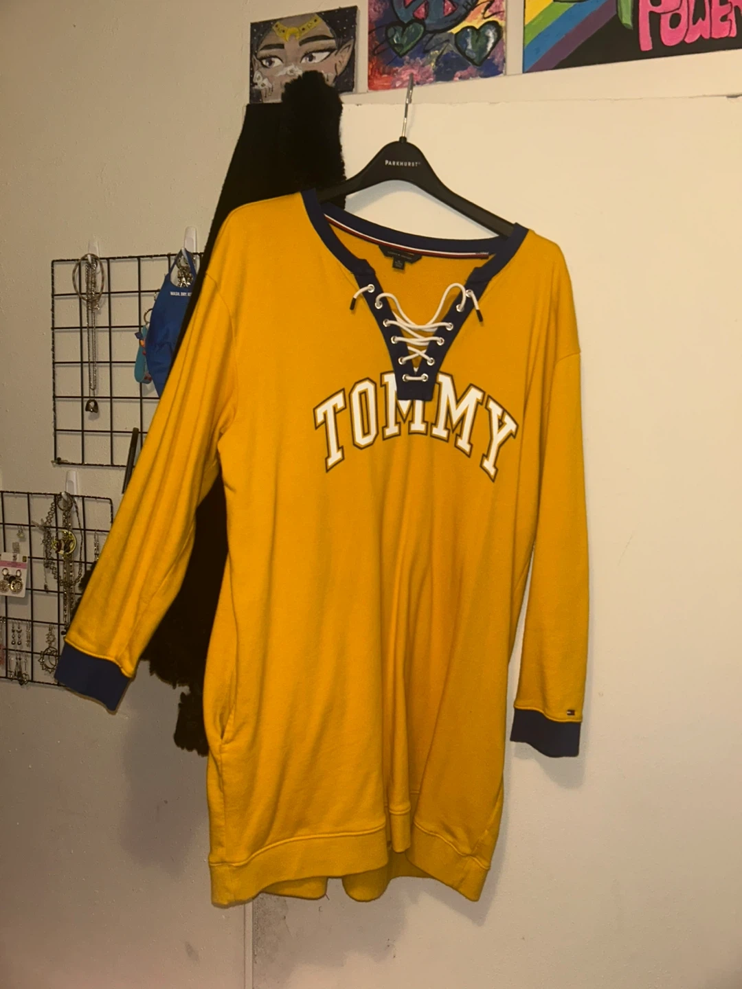 here's a barely worn XL gold-amber yellow sweater dress by Tommy Hilfiger. Features signature dark blue lining, and white logo + drawstrings. In my opinion, it's true to the size and fits a bit loosely. Doesn't have a hood but it does have hidden pockets on both sides!