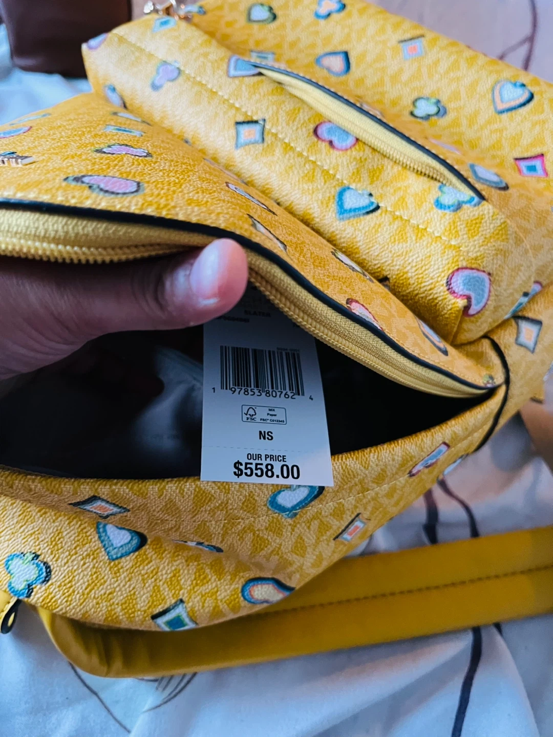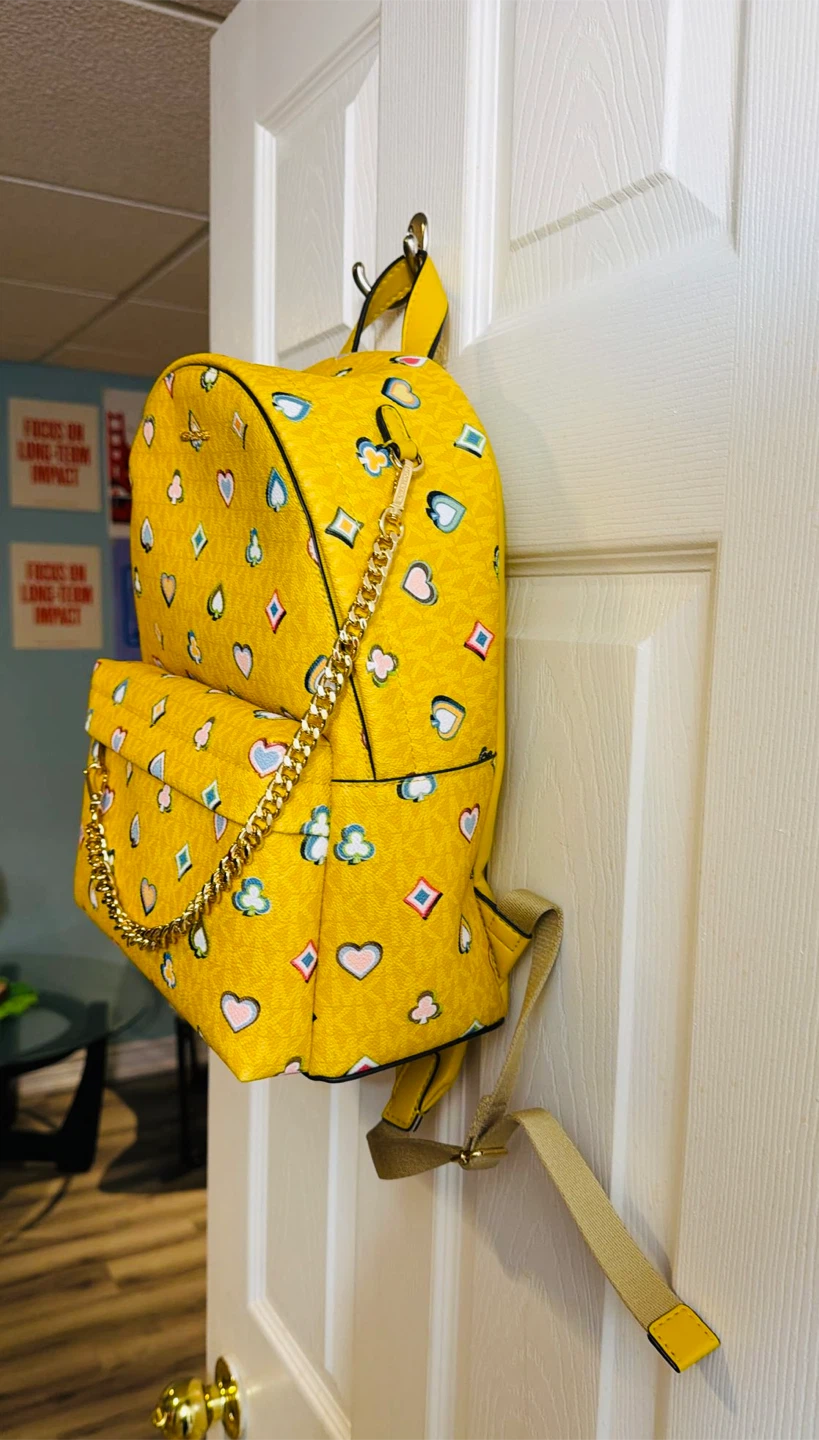Check out this stylish Michael Kors backpack! It's a vibrant yellow colour and features a fun pattern with hearts, diamonds, clubs, and spades. It also has a gold chain detail on the front. Perfect for adding a pop of colour to your outfit!
