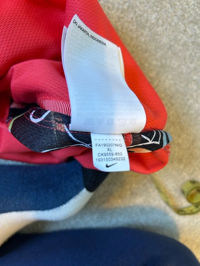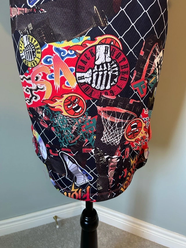 This item has been authenticated as Authentic by LegitGrails (see certificate in photos for verification). Step up your streetwear game with this incredibly rare and authentic Nike Sportswear mesh jersey dress/tunic! This piece is a true standout with a vibrant, oversized fit and an intricate graphic print that is a nostalgic nod to early 2000s street art and pop culture. Key Features: Color & Fabric: Bright coral/neon reddish-pink mesh body for breathability, perfect for a sporty or edgy look. The material is 75% Polyester, 25% Spandex. Unique Graphic Print: The sleeves and back panel feature a dense, collage-style graphic print on a black background, complete with a fence/chain-link pattern overlay. The graphics include: Bold "Fighter" text with a dragon. Cartoon duck characters in sports gear. Basketball hoops and flaming basketballs. Nostalgic elements like CDs/discs marked with what appears to be a date '2001.7.11'. Stylized sneakers. Oversized Fit: Features a relaxed, baggy fit that can be worn as a mini-dress, a long tunic, or a jersey over bike shorts or leggings. Details: Large "NIKE" lettering stitched across the chest. Ribbed coral crew neck and sleeve trim. Small woven patch with a circular Nike logo design near the hem (image 3921). Condition: Excellent, like-new condition. Please refer to all photos for the exact condition. No noticeable flaws, holes, or stains.