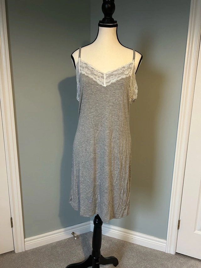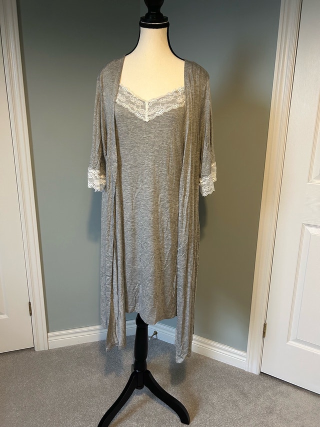 New SHEIN 2-Piece Loungewear Set. This is a beautiful and cozy two-piece loungewear or pajama set from SHEIN, perfect for relaxing at home! What's Included: Sleeveless Chemise/Nightgown: Simple, straight cut with spaghetti straps. Matching Open Robe/Cardigan: Short-sleeve, open-front design. Key Features: Color: Heather Grey / Charcoal Fabric: Soft, stretchy knit material (98% Polyester, 2% Elastane) for ultimate comfort. Detailing: Delicate white lace trim along the V-neckline of the chemise and the cuffs of the robe for a feminine touch. Style: Great for sleep or just lounging around the house. Size & Fit: Size on Tag: XL Please note: Shein sizing can sometimes run smaller; refer to your preferred Shein size for best fit. Material & Care: Composition: 98% Polyester, 2% Elastane (as per tag) Care Instructions: Machine wash cold with like colors, gentle wash, do not bleach, tumble dry low, iron needed (as per tag). Photos included: Chemise alone (front and back), robe and chemise set, and close-ups of the care/composition/size tags. Comes from a smoke-free home. Questions are welcome!