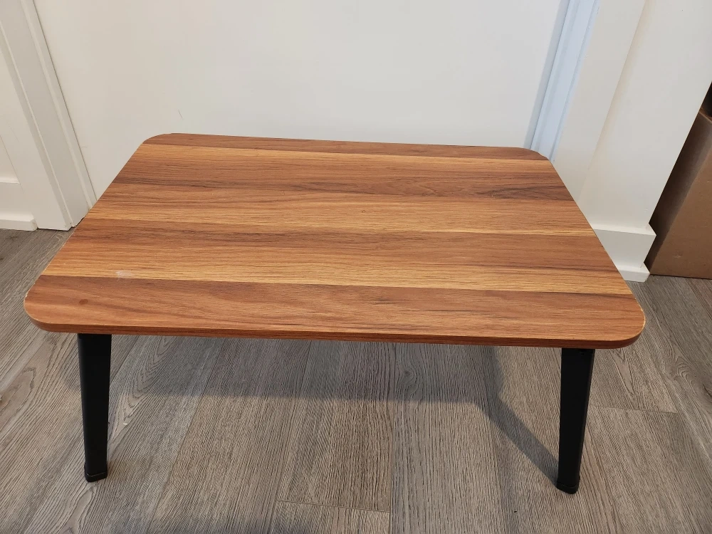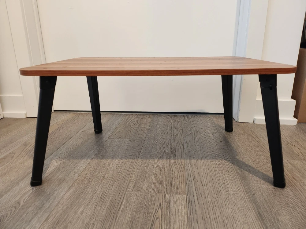 Selling a wood coffee table with black legs. It's in great condition and would look great in any living room or den. It's a sturdy table, perfect for coffee, books, or decor