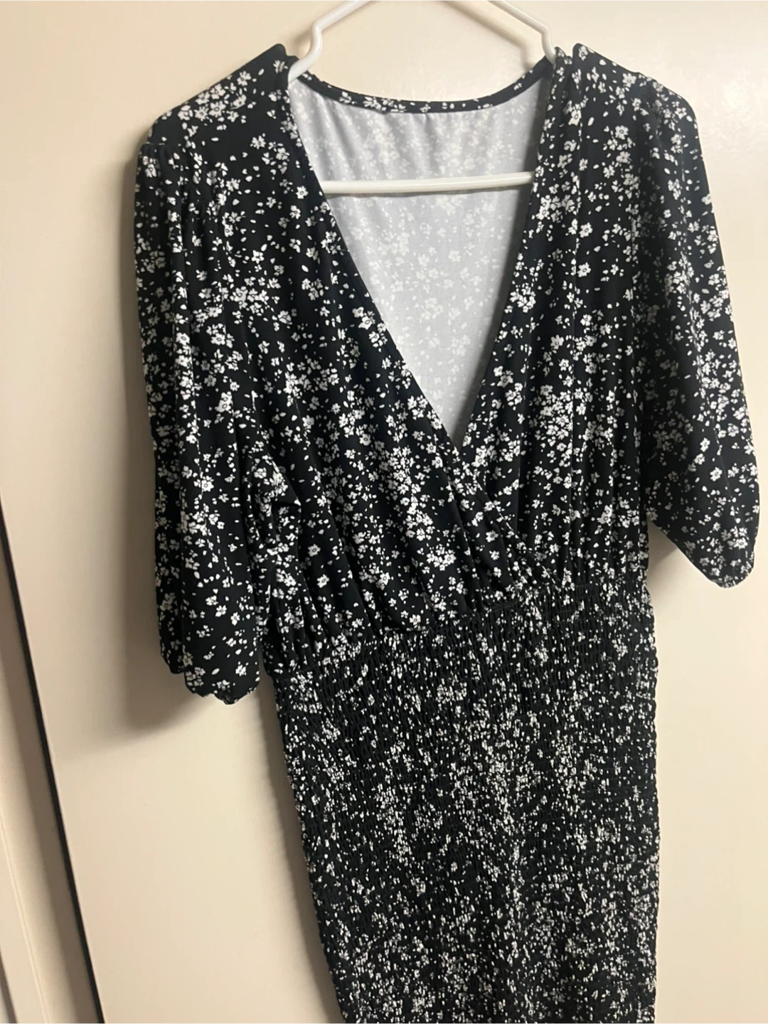 Cute black and white floral mini dress! It features a flattering V-neck and an elasticated waist for a comfortable fit. Perfect for summer days or evenings out.