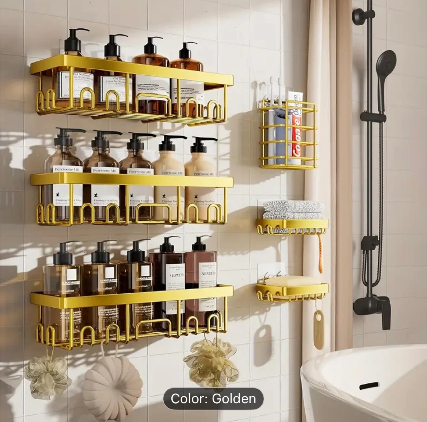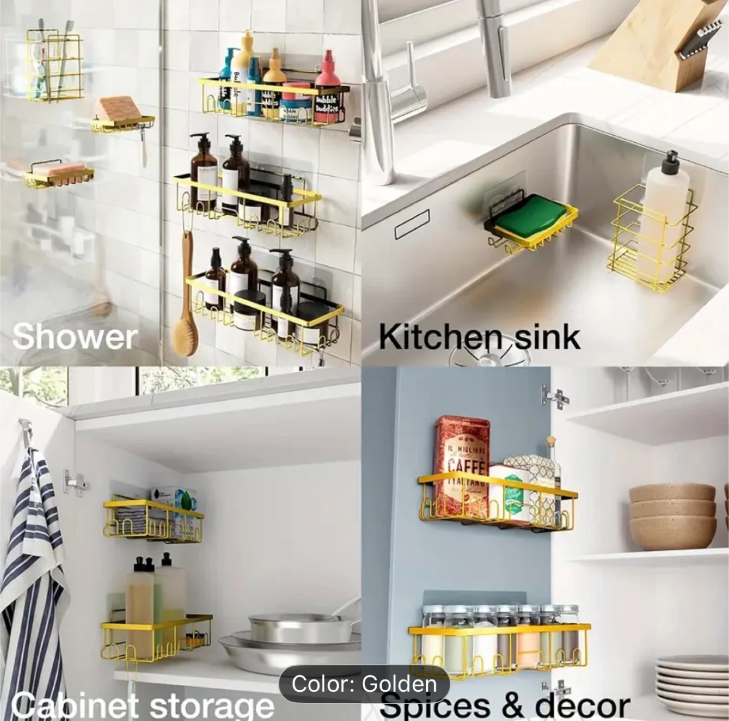 Declutter your space with this golden organizer! Perfect for the bathroom, kitchen, or even cabinet storage. It's a stylish way to keep your essentials tidy and within reach. Bathroom caddy.
