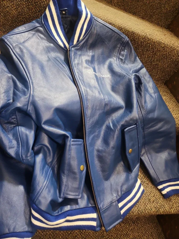 Gorgeous Standout Unisex 😎 Cool Blue leather bomber jacket with Hood Credit will have you rolling in compliments! It's a smallish size medium (Think Tall&Skinny) has a classic Varsity style with white striped detailing on the collar, cuffs, and hem. The thick rich calf leather has a nice sheen and it's in great condition. Fits like smallish medium. Add a pop of colour to your wardrobe! Cause Girl's is Players too!!😁😆 Perfect for Xmas Gift🎁value$650.